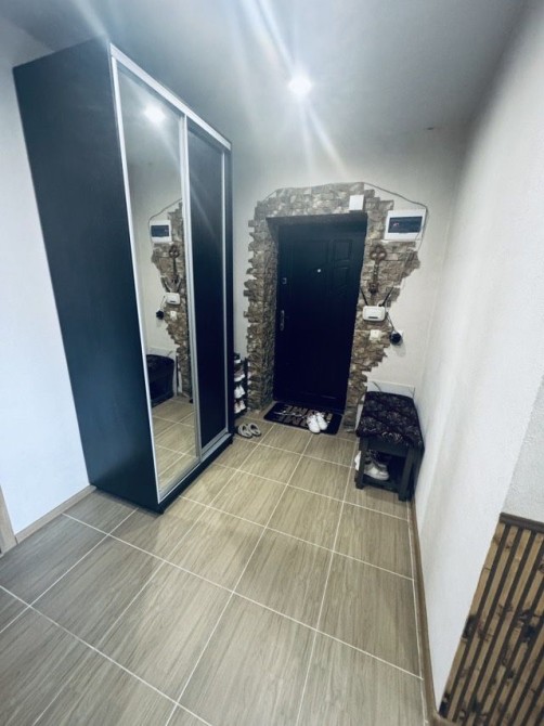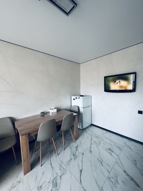 Є зона відпочинку, зона кухні, окремий санвузол з душем, окремий коридор з шафою. Все обставлено меблями та технікою - розкладний диван, холодильник, мікрохвильова піч, телевізор, стіл, стільці, комод, пральна машина, бойлер.