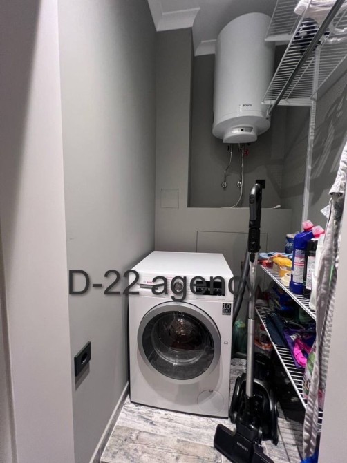 Простора ванна кімната оснащена якісною сантехнікою та сучасною душовою кабіною. Окреме технічне приміщення з прально-сушильною машиною й додатковими місцями для зберігання робить проживання ще більш комфортним.