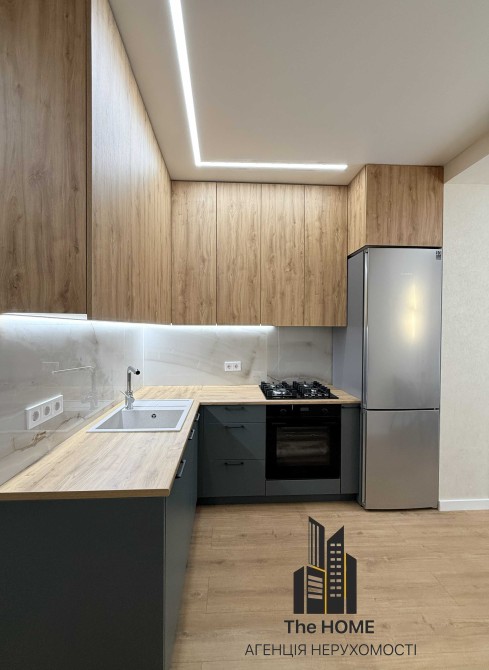 Кухня оснащена крутою вбудованою технікою від провідних брендів: варильна поверхня, духова шафа, посудомийна машина, холодильник — усе підібрано для максимального комфорту та естетики. Зона кухні плавно переходить у вітальню, створюючи ідеальний простір для життя та відпочинку.