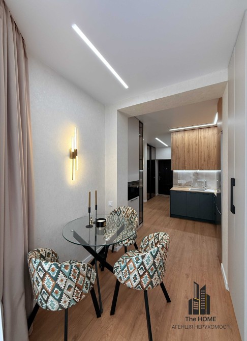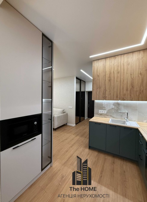 Інтер’єр виконаний у світлих та смарагдових, трендових відтінках із продуманими дизайнерськими акцентами. Квартира виглядає просторо та дорого завдяки якісним матеріалам, стильному освітленню та грамотному зонуванню.
