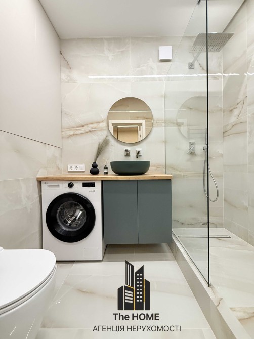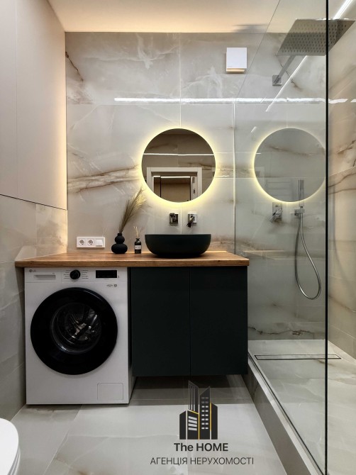 Санвузол виконаний у сучасному стилі, з якісною сантехнікою, великою душовою зоною та продуманими системами зберігання.