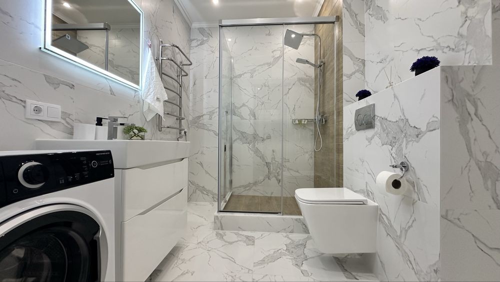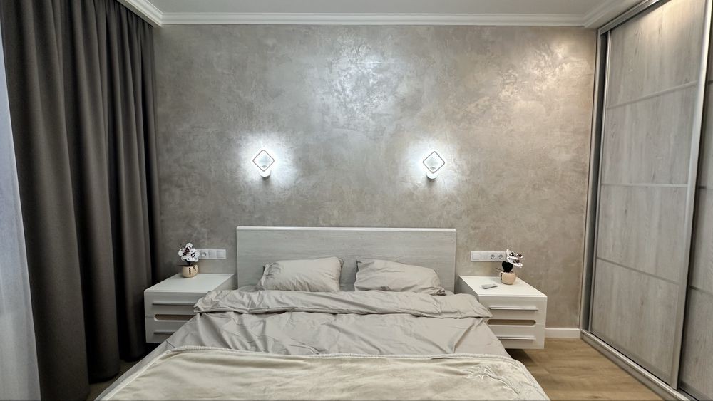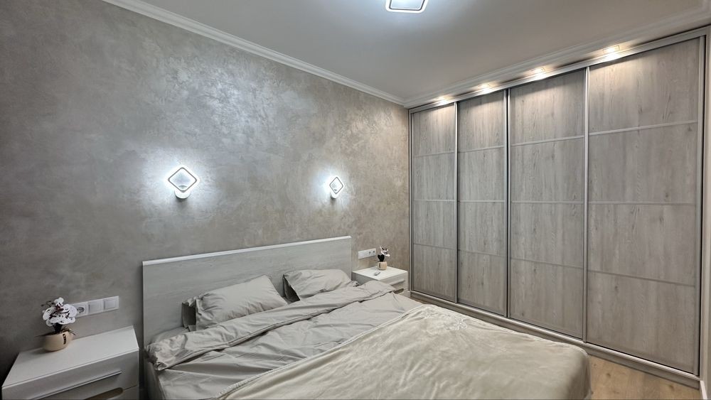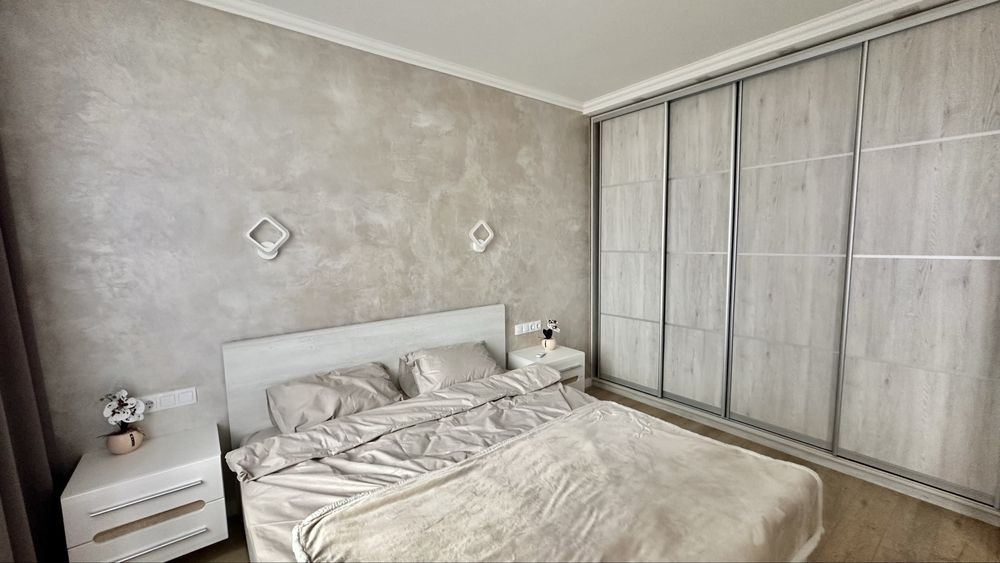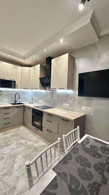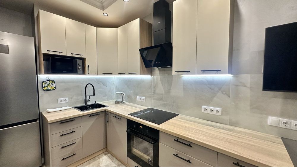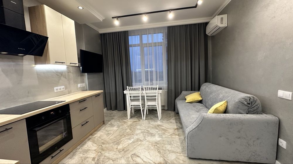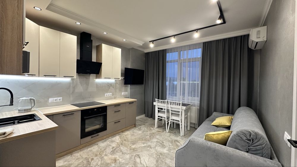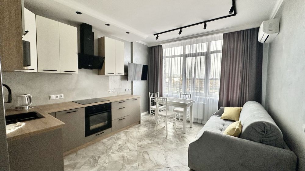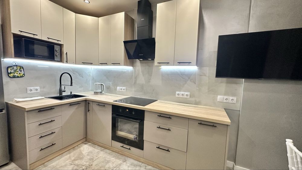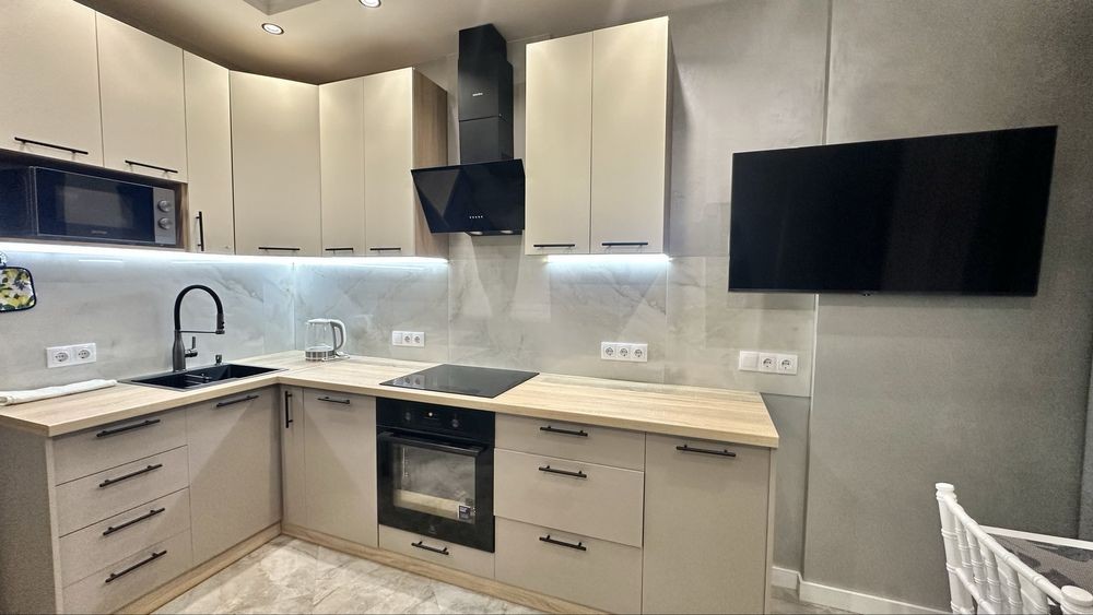 Повна комплектація меблів та техніки: посудомийка, мікрохвильовка, індукційна плита, духова шафа, кондиціонер, телевізор, чайник, бойлер, пральна машинка.