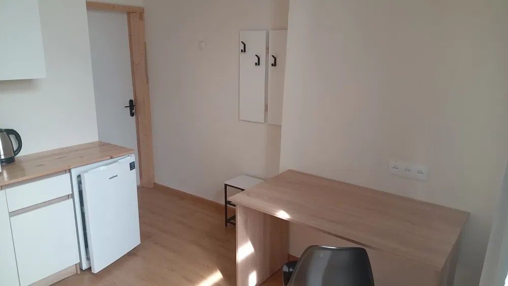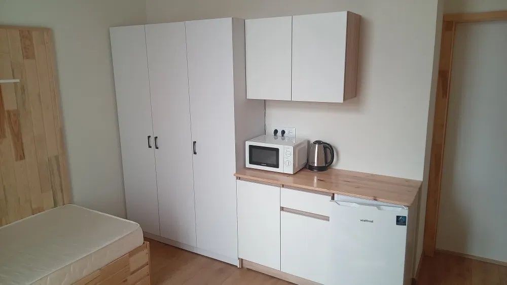 У кімнаті є мінікухня, холодильник, мікрохвильова піч, електрочайник, велика шафа, стіл, ліжко.