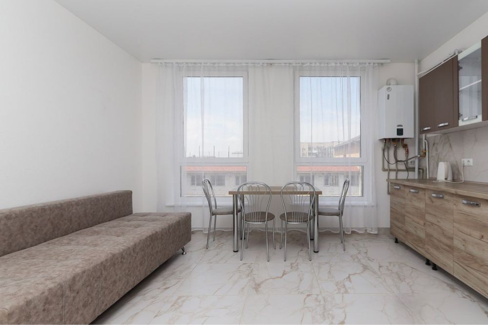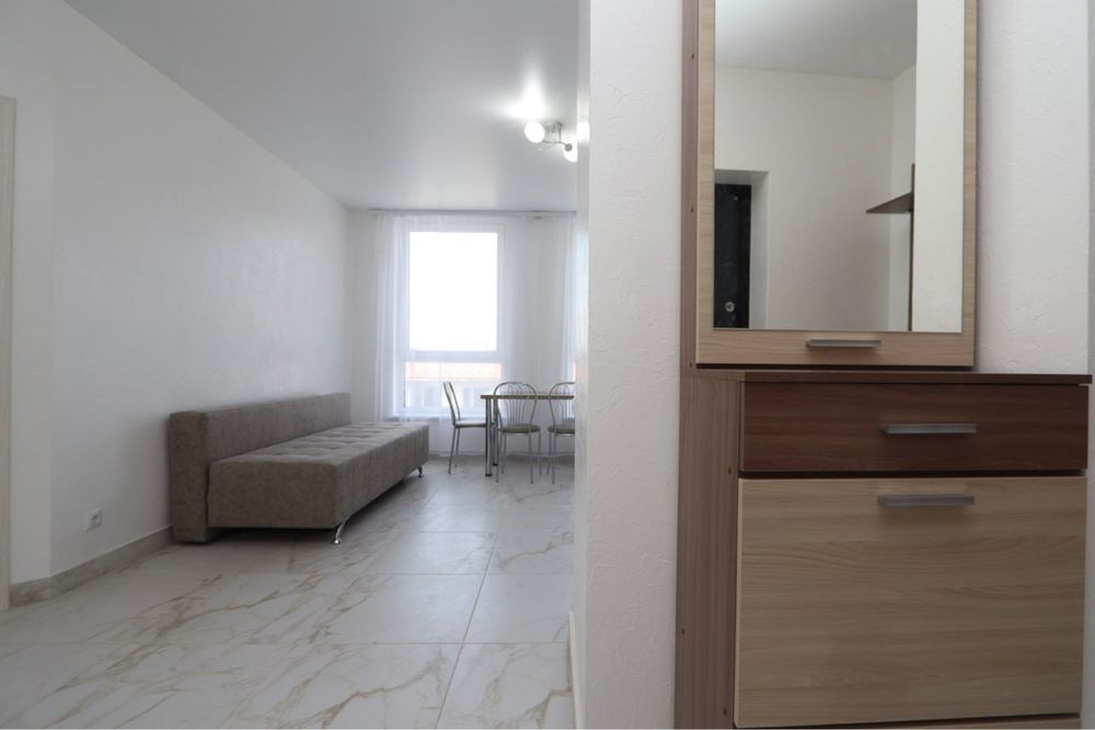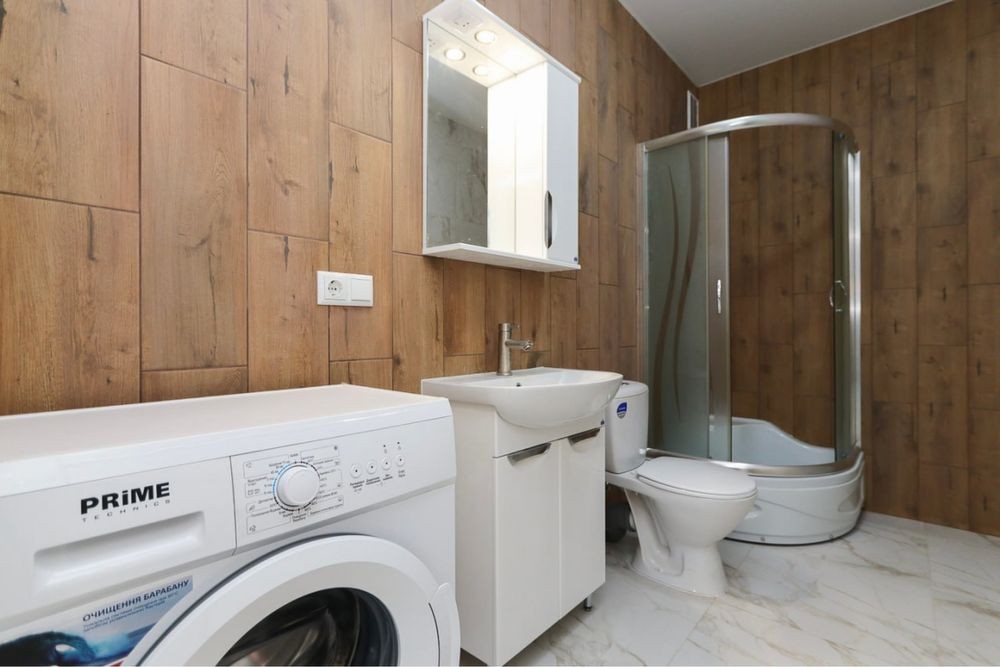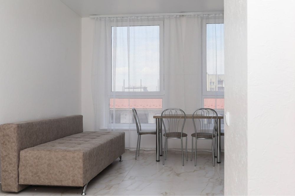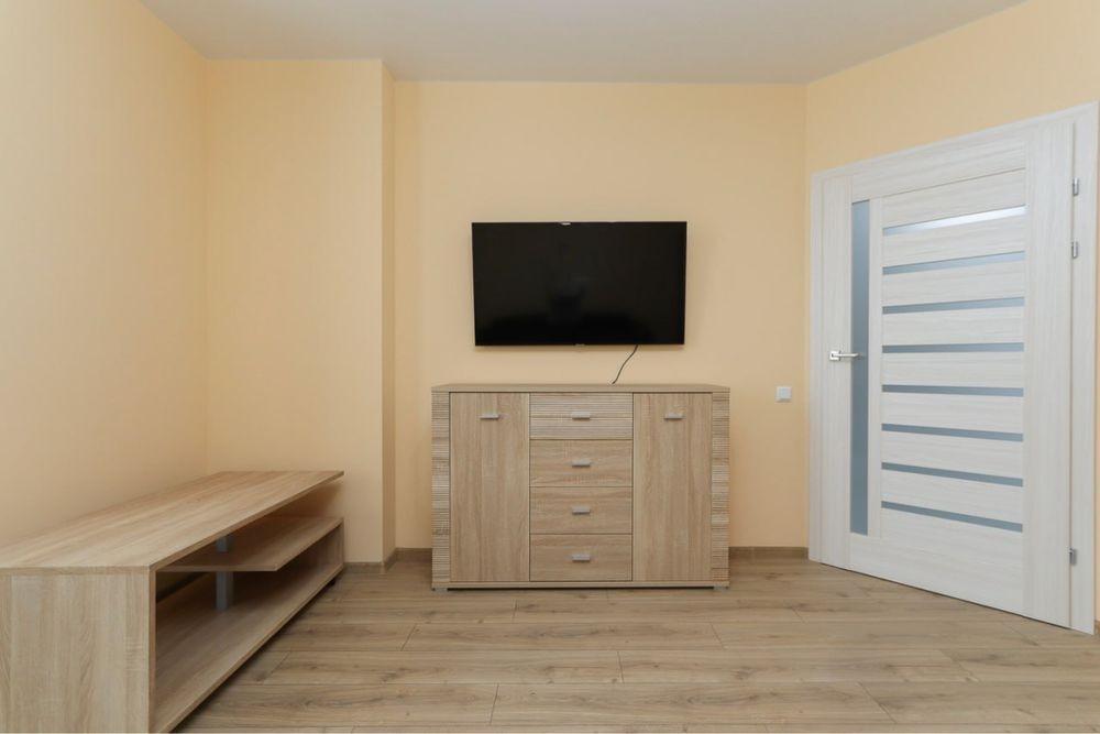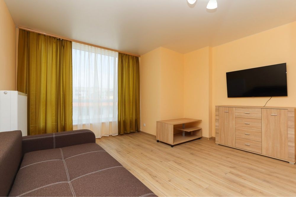 Затишна квартира має побутову техніку, меблі та все необхідне для комфортного тривалого проживання. У квартирі окрема мебльована спальна кімната з міжкімнатними дверима, кухня-студія площею 12 м2, сумісний санвузол з душовою кабіною та якісною сантехнікою.