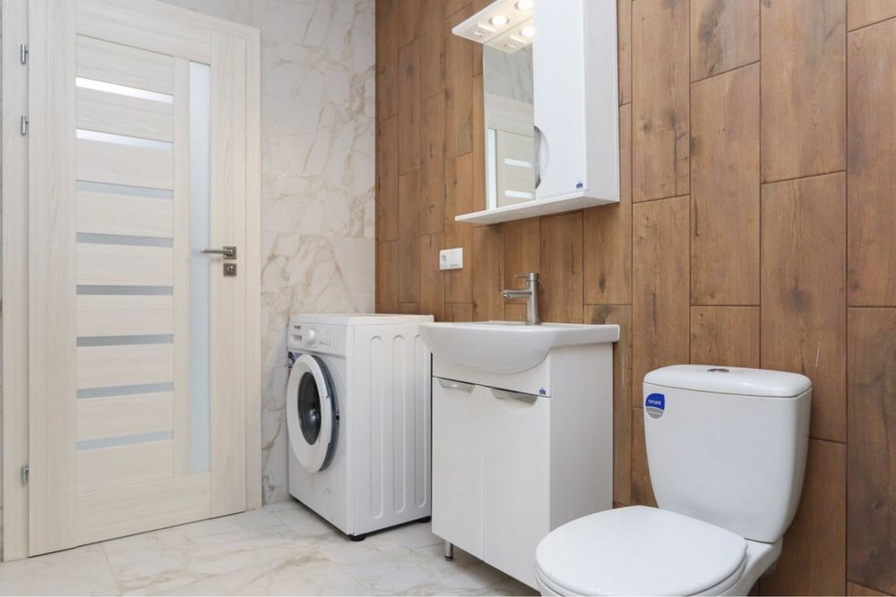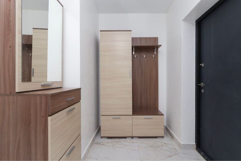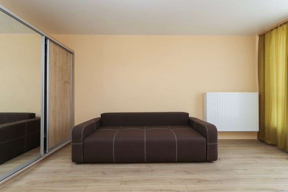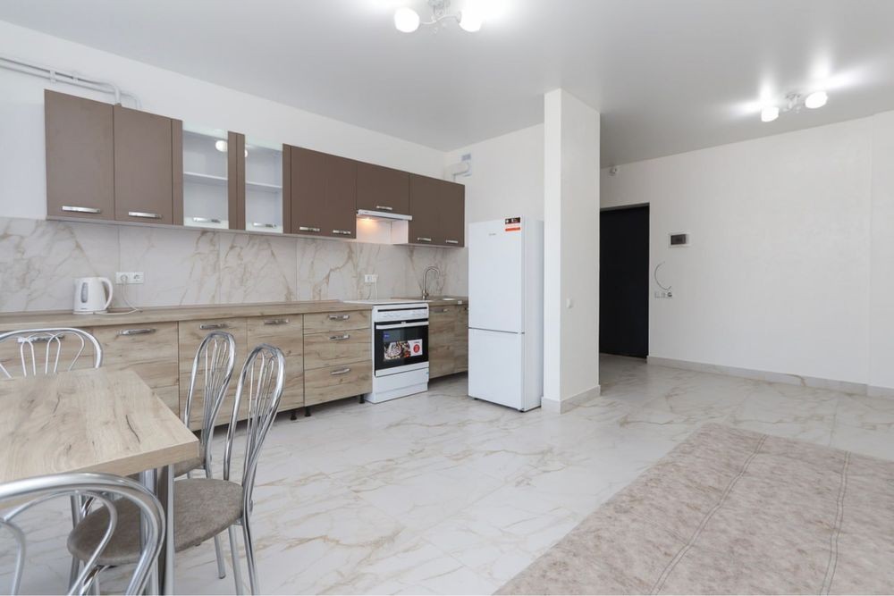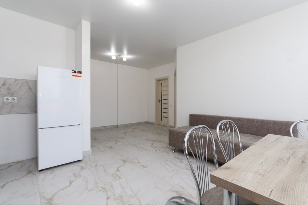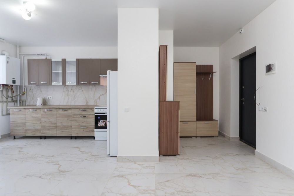 Затишна квартира має побутову техніку, меблі та все необхідне для комфортного тривалого проживання. У квартирі окрема мебльована спальна кімната з міжкімнатними дверима, кухня-студія площею 12 м2, сумісний санвузол з душовою кабіною та якісною сантехнікою.