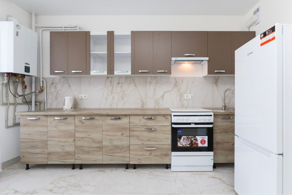 Кухня обладнана шафами для посуду, холодильником, витяжною вентиляцією, плитою, електрочайником, духовкою, має зручну обідню зону.