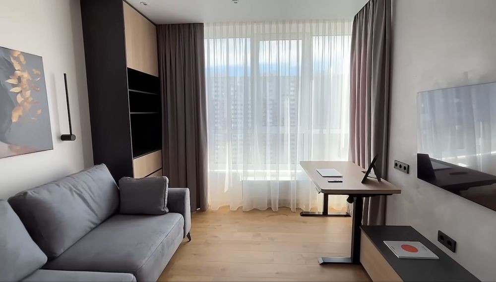 Зручне планування: ізольована спальня, кабінет та простора кухня-студія.