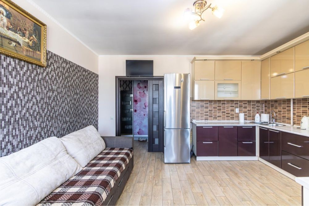 У квартирі велика кухня-студія з зоною відпочинку. На кухні є диванчик, телевізор, а також підігрів підлоги, що додає комфорту в холодну пору року. З кухні є вихід на лоджію.
