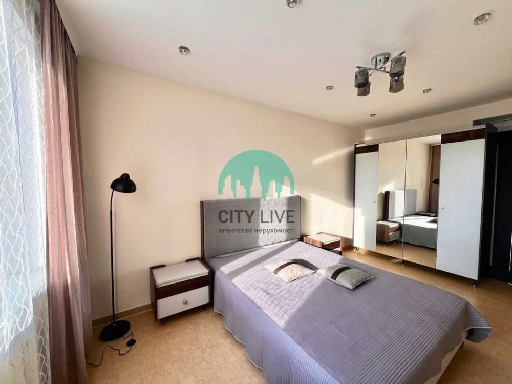 • Спальня: двоспальне ліжко з ортопедичним матрацом, містка шафа-купе з дзеркалами.