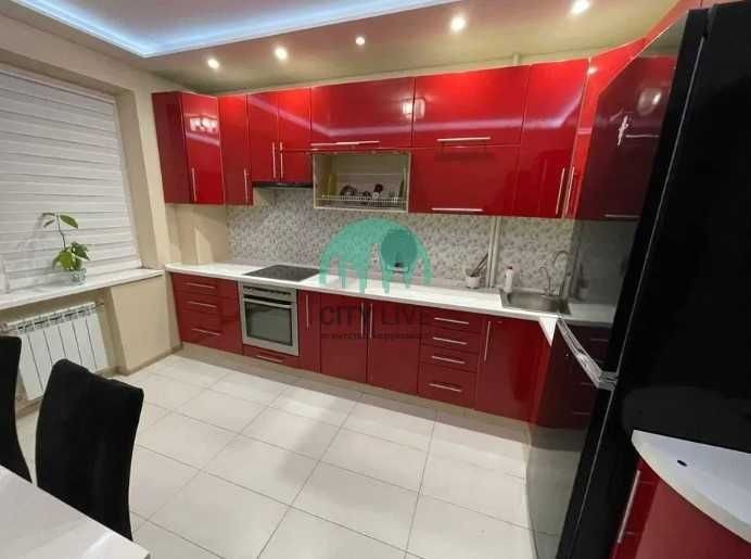 • Кухня: сучасний гарнітур у насиченому червоному кольорі, обладнана духовою шафою, варочною поверхнею та холодильником.