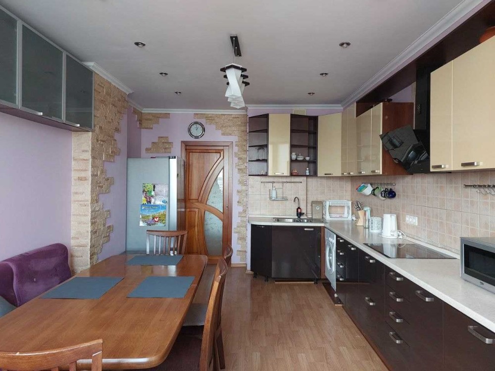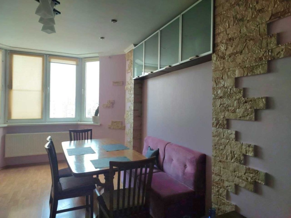 Квартира розташована на 9-му поверсі 17-поверхового цегляного будинку, має загальну площу 75 м².
