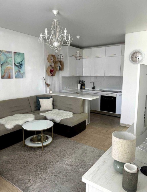 • вітальня з диваном та телевізором, переходить у кухню-студію;