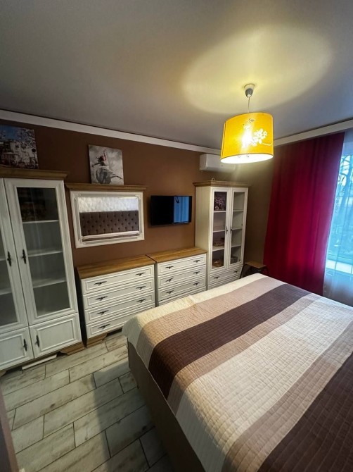 Квартира має окрему кімнату. Облаштована спальня з двоспальним ліжком, комодами, шафами та телевізором.