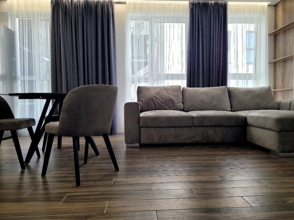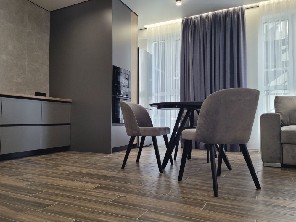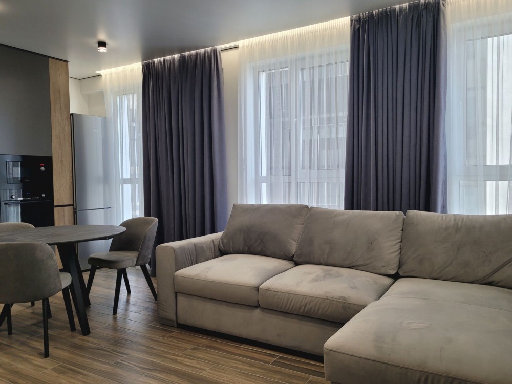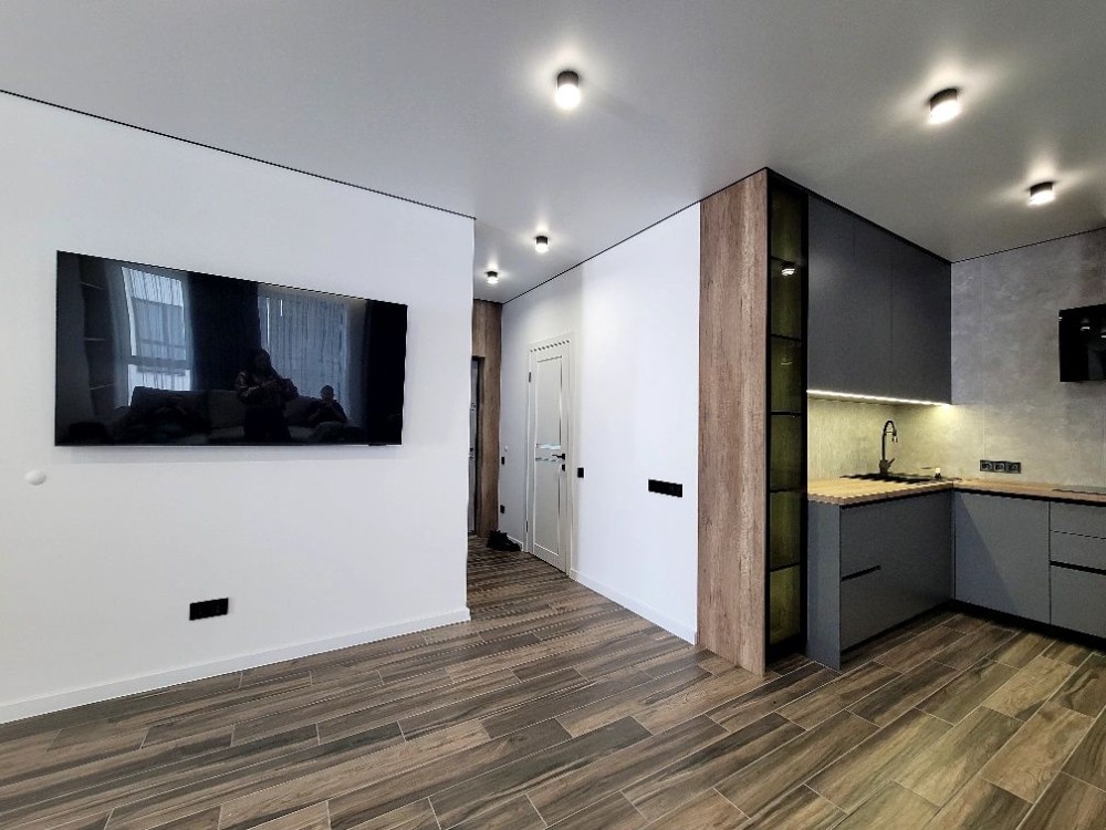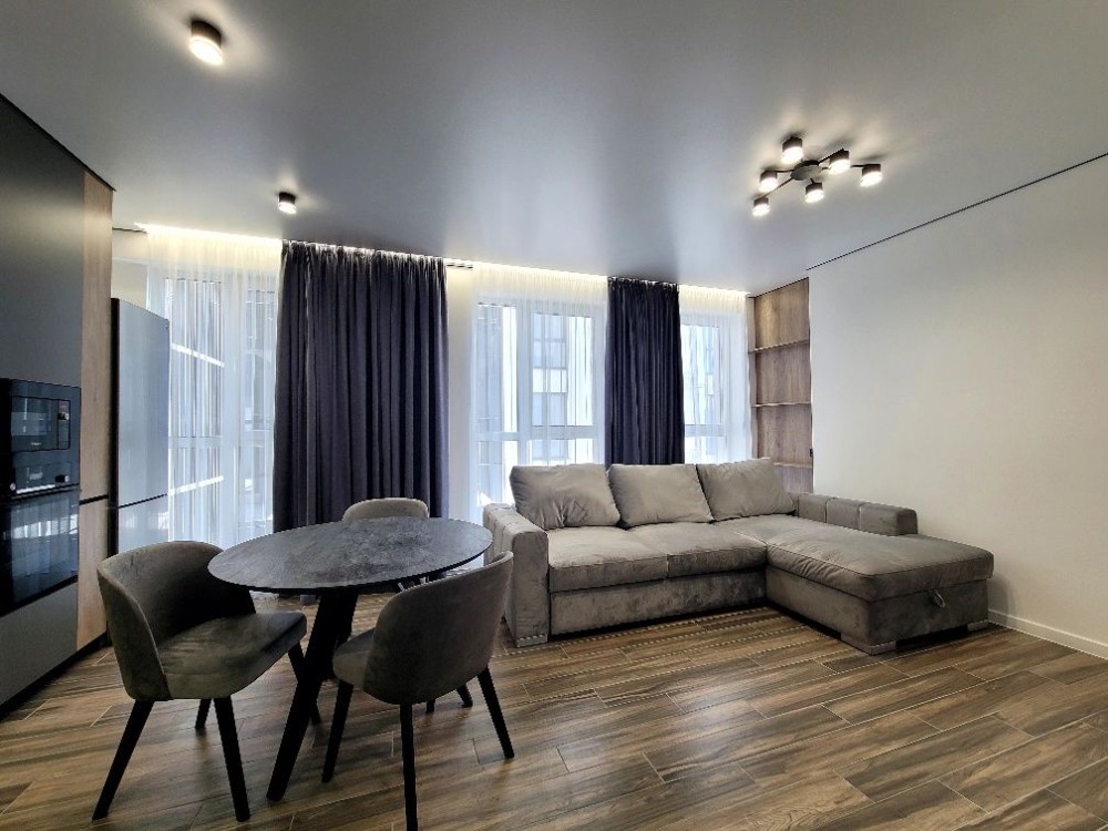 Інтер’єр виконаний за авторським проєктом. Квартира повністю укомплектована меблями та технікою: холодильник з морозильною камерою, електрична плита та духова шафа, мікрохвильова піч, посудомийна машина, пральна машина із сушкою, телевізор, бойлер, фільтри для побутової та харчової очистки води