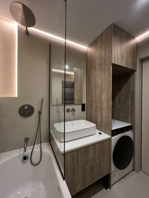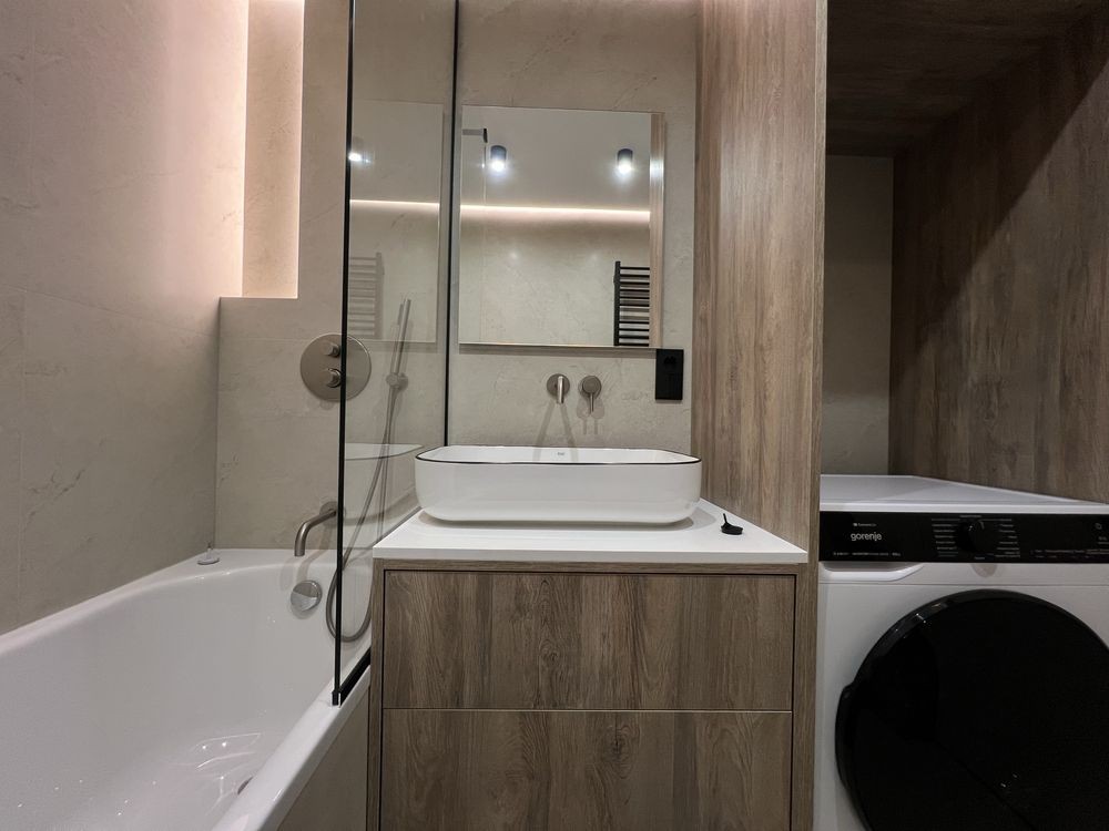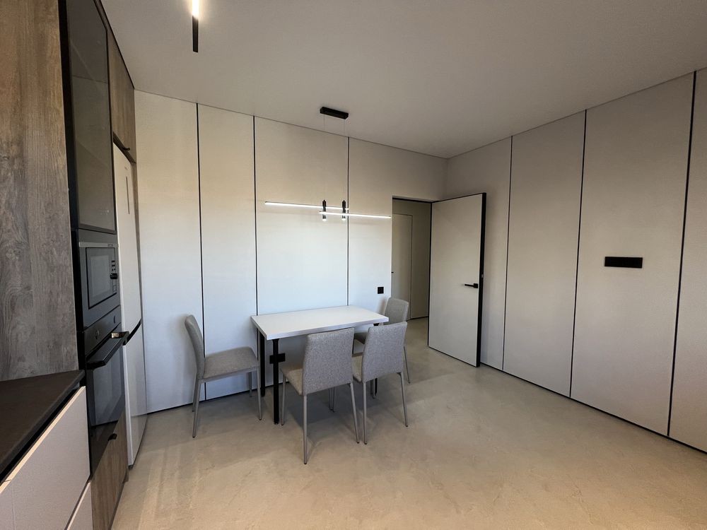 Новий якісний дизайнерський ремонт, повністю облаштована меблями та технікою: вбудовані духова шафа, газова поверхня, мікрохвильова піч, посудомийна машина. В кімнатах два телевізори та кондиціонери. У ванній кімнаті - нова прально-сушильна машина. Є окрема гардеробна кімната. Підігрів підлоги - кухня та ванна кімната.