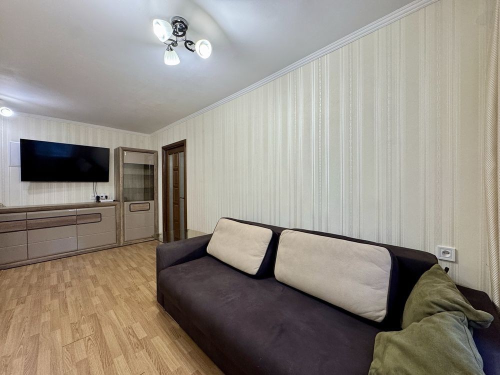 • Меблі та техніка: двоспальне ліжко, розкладний диван, шафа-купе, комод, стіл та стільці, телевізор, холодильник, мікрохвильова піч, варильна панель, електрочайник, пральна машина, рушникосушка
