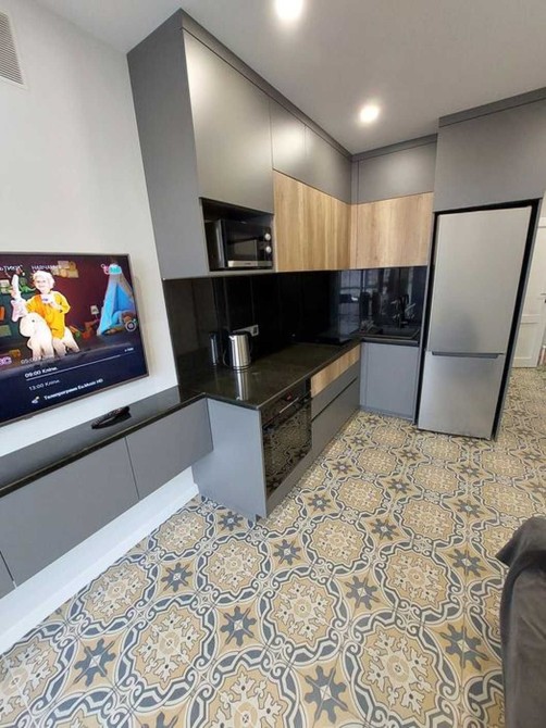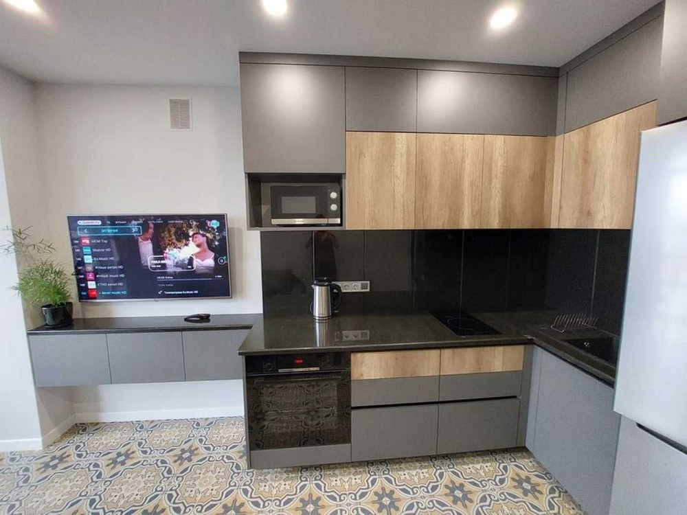 Є холодильник, духовка, мікрохвильовка, індукційна варочна поверхня.