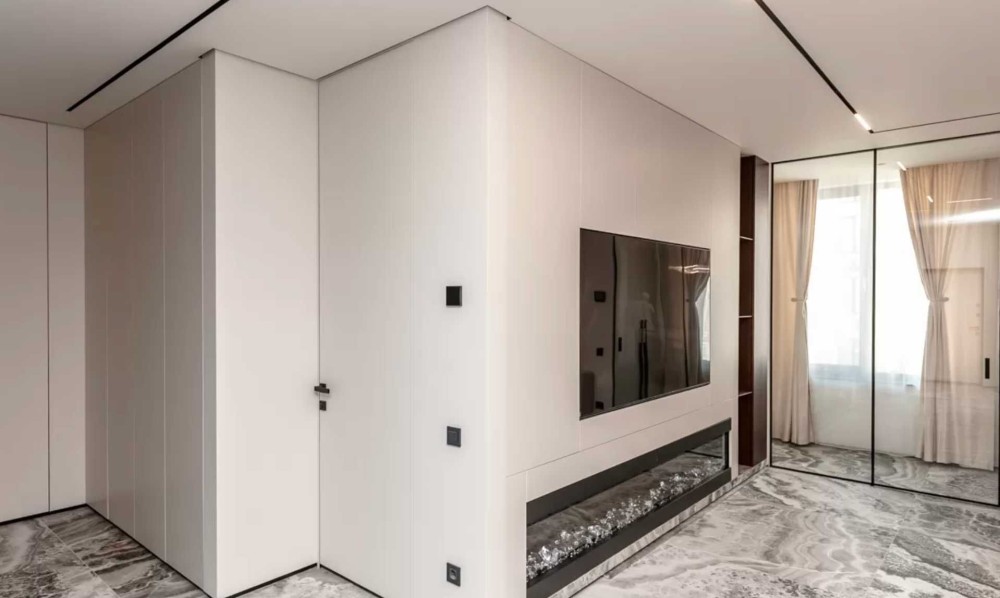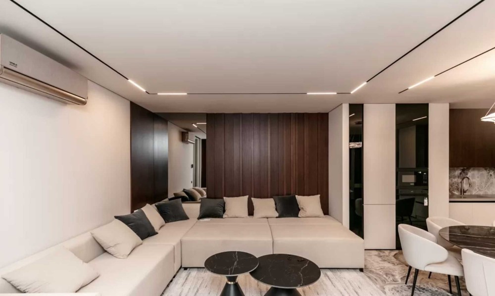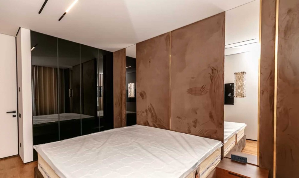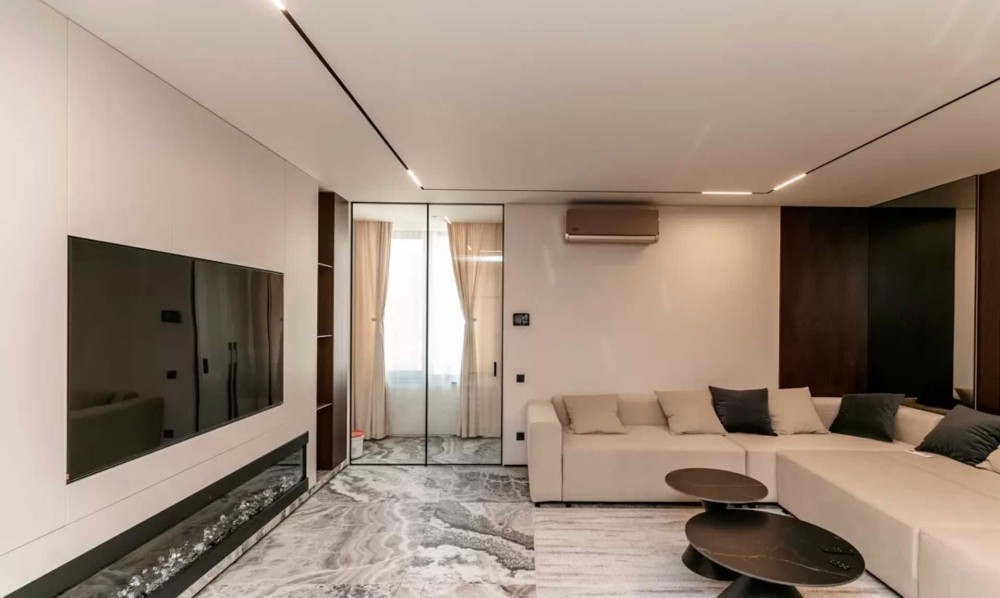 Квартира площею 75 м² з продуманим плануванням: дві окремі спальні та простора вітальня зона з великою ТВ-зоною. Інтер’єр сучасний, виконаний у світлих тонах, що створює відчуття простору та затишку.