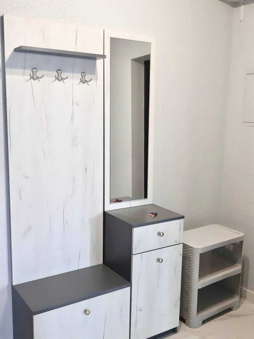 Роздільний санвузол, гардеробна кімната. Диван, двоспальне ліжко з каркасним матрацом, шафи.