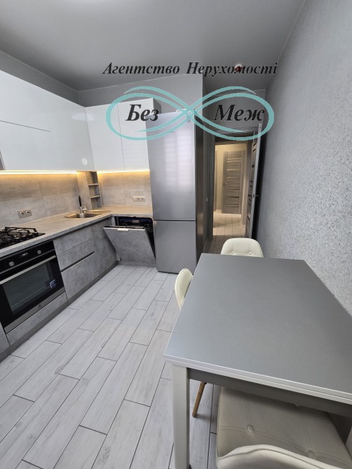 Кухня: вбудовані меблі, газова плита, духова шафа, витяжка, холодильник, посудомийна машина, мікрохвильова піч, обідній стіл та стільці.