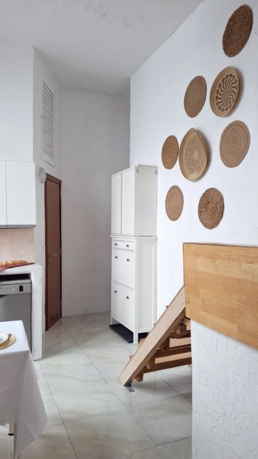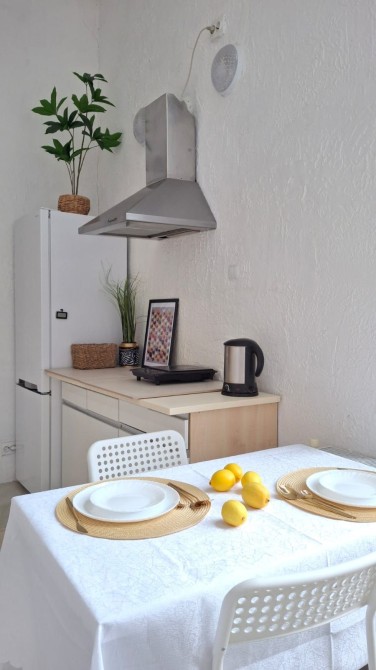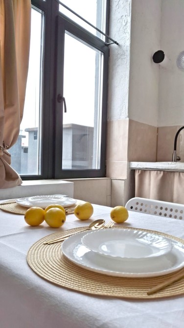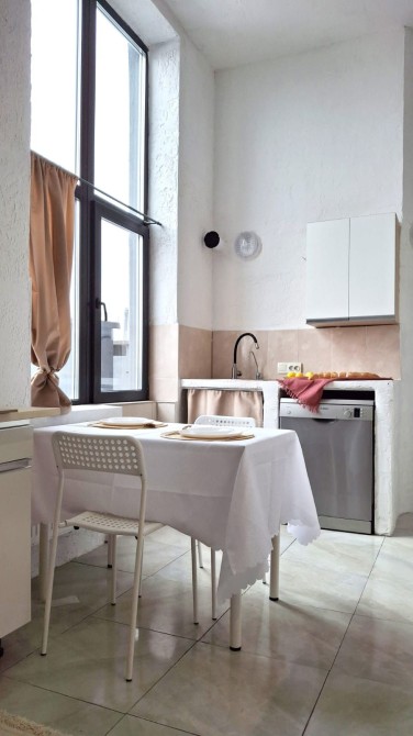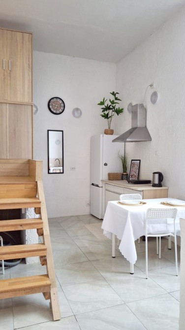 Кухня-студія з диваном та обіднім столом;