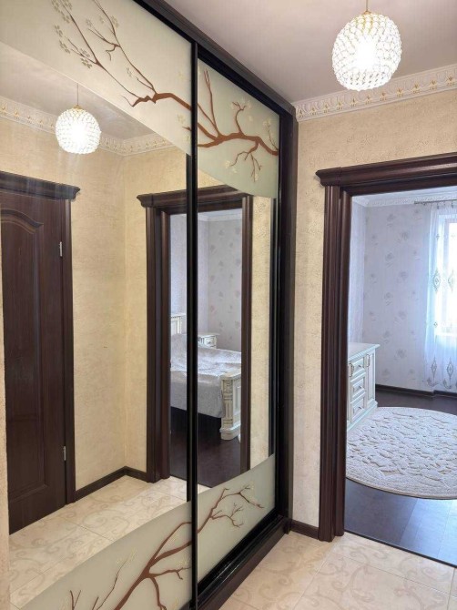 Функціональне планування включає розділений коридор із місткою шафою-купе та великою прихожою, де встановлено стильне вмонтоване дзеркало з декоративною ліпниною. Спальня облаштована двоспальним ліжком, комодом та приліжковими тумбами, що створює затишний простір для відпочинку.