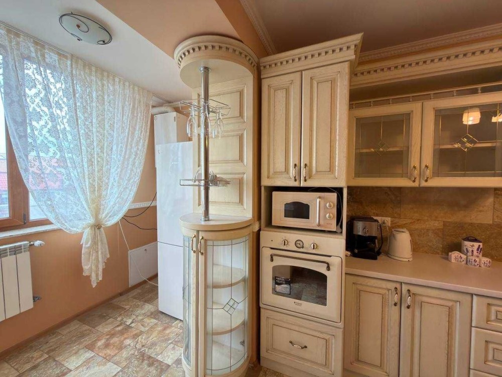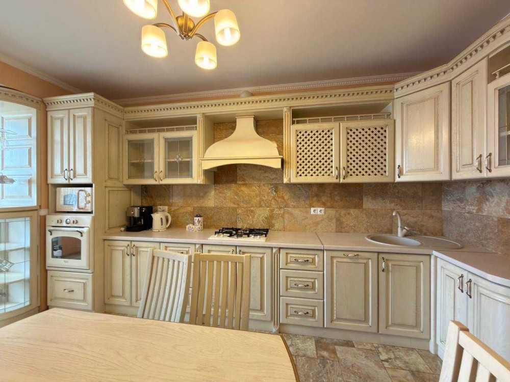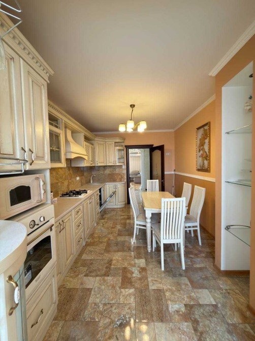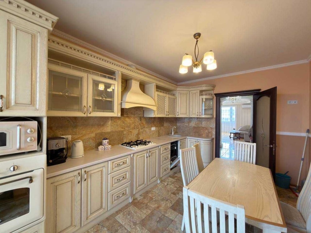 Квартира вирізняється якісним дизайнерським ремонтом із використанням дорогих матеріалів та продуманим плануванням. Простора кухня повністю укомплектована всією необхідною побутовою технікою, включаючи посудомийну машину, а також обладнана обідньою зоною зі столом та стільцями — ідеальне місце для сімейних вечерь та прийому гостей.