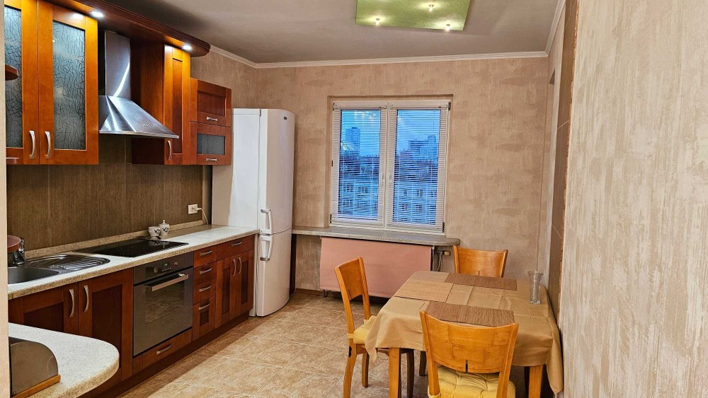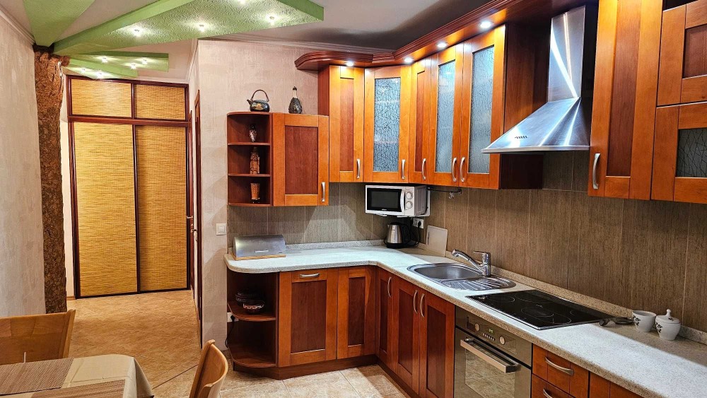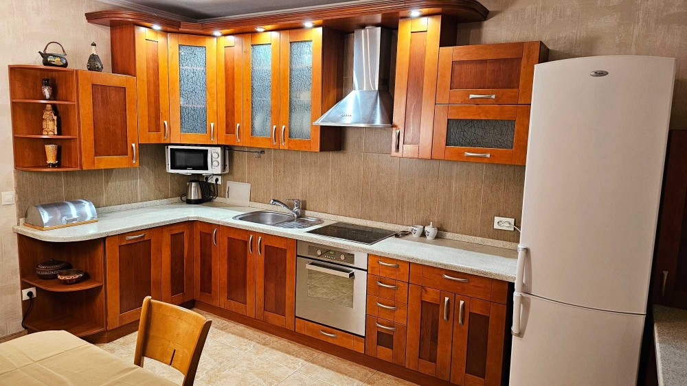 • Кухня-їдальня - простора, з виходом на лоджію. Повний набір кухонного обладнання та меблів, обідній розкладний стіл з набором стільців.