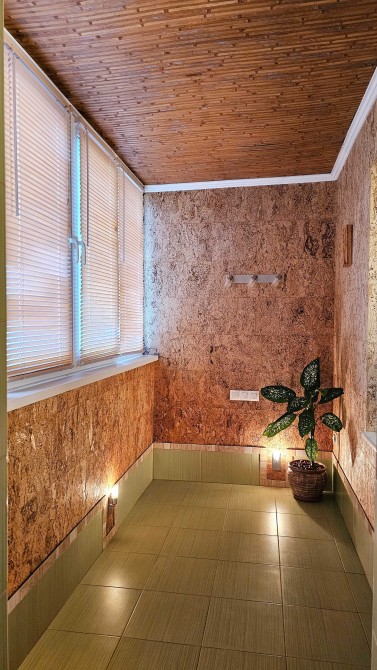 • Лоджія - повноцінно функціональна засклена та утеплена лоджія, оброблена пробкою та бамбуком, обладнана електричною теплою підлогою і може використовуватися цілий рік як місце для відпочинку або робочого кабінету. Є невеликий робочий стіл та два види освітлення залежно від способу використання.