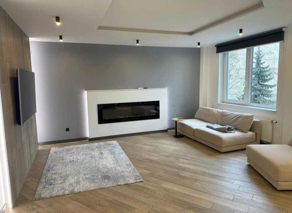 Квартира має кухню, облаштовану всією технікою, відпочинкову залу з електричним каміном, дві ізольовані спальні кімнати, гардеробну, суміжній санвузол та балкон.