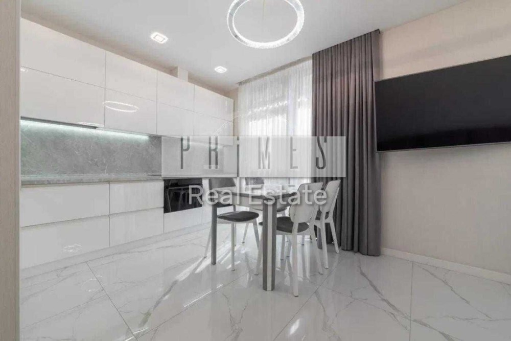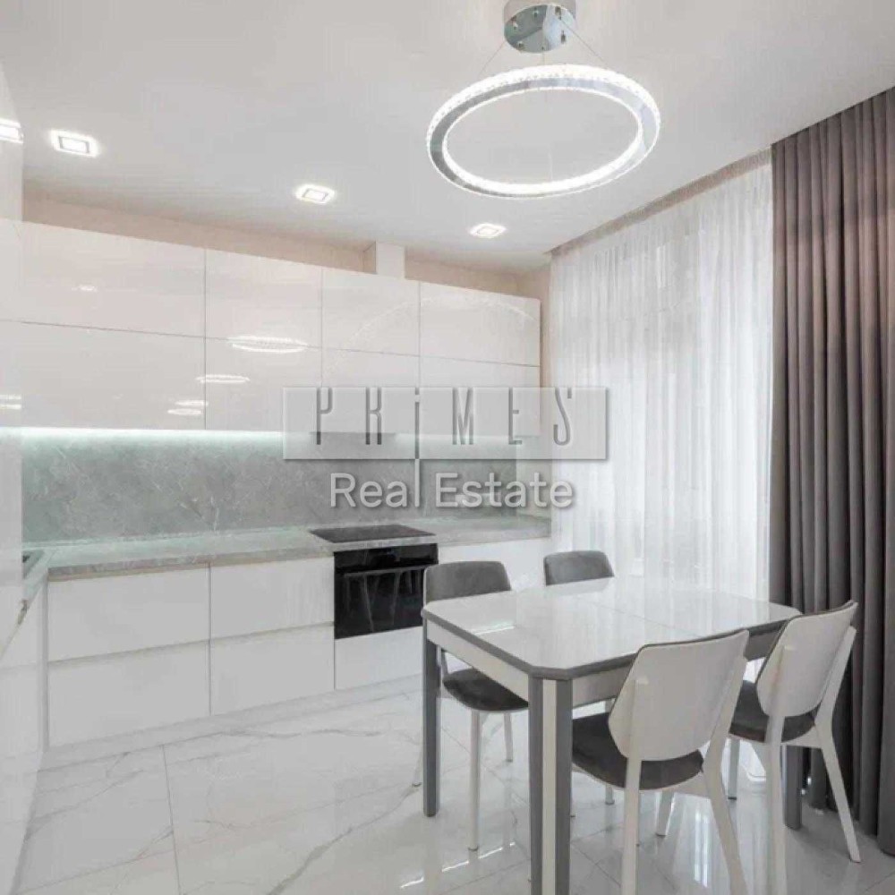 Планування передбачає велику кухню-студію, об’єднану з вітальнею — ідеальний простір для прийому гостей і комфортного відпочинку. Кухня укомплектована сучасною вбудованою технікою: духовою шафою, варильною поверхнею та витяжкою. Панорамні вікна наповнюють оселю природним світлом.