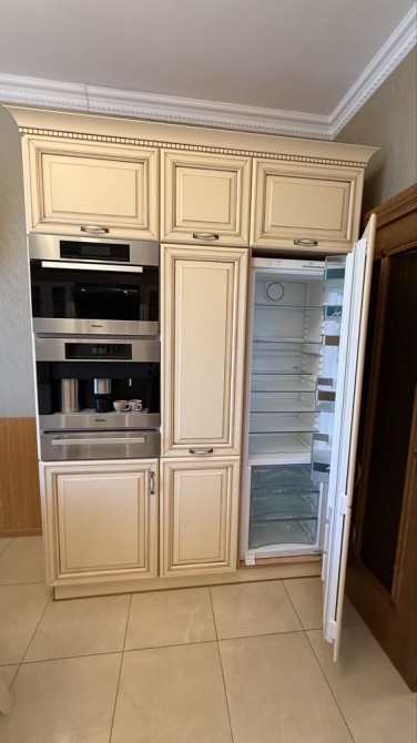 Кухня повністю укомплектована преміальною технікою Miele: посудомийна машина, плита, духова шафа, холодильник, додаткова морозильна камера, кавова машина, пароварка.