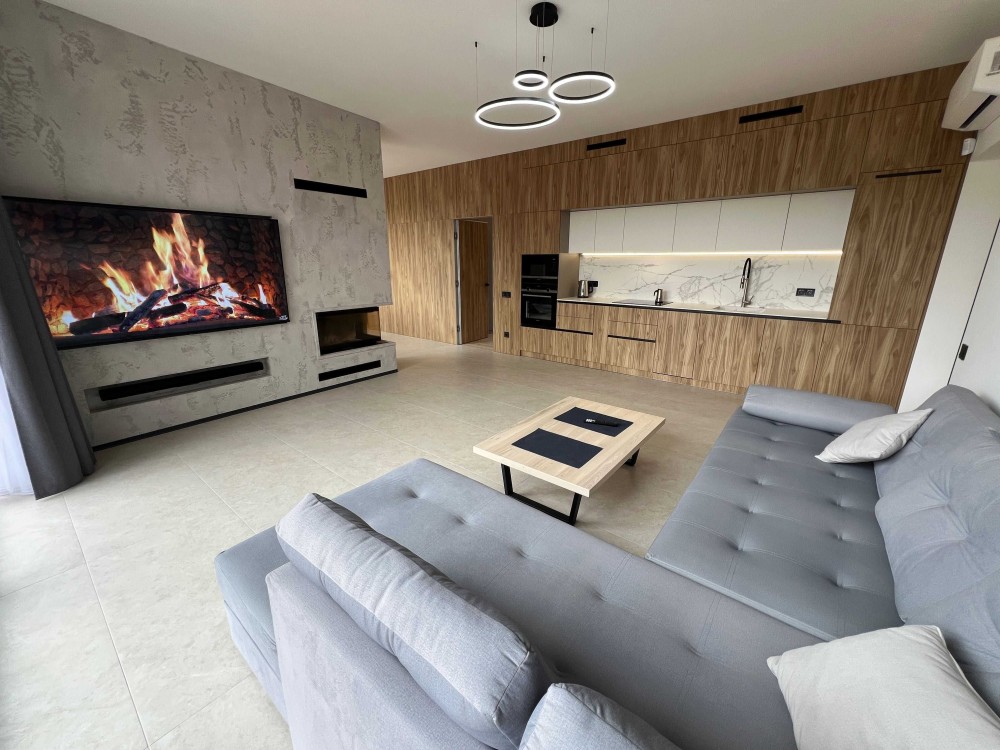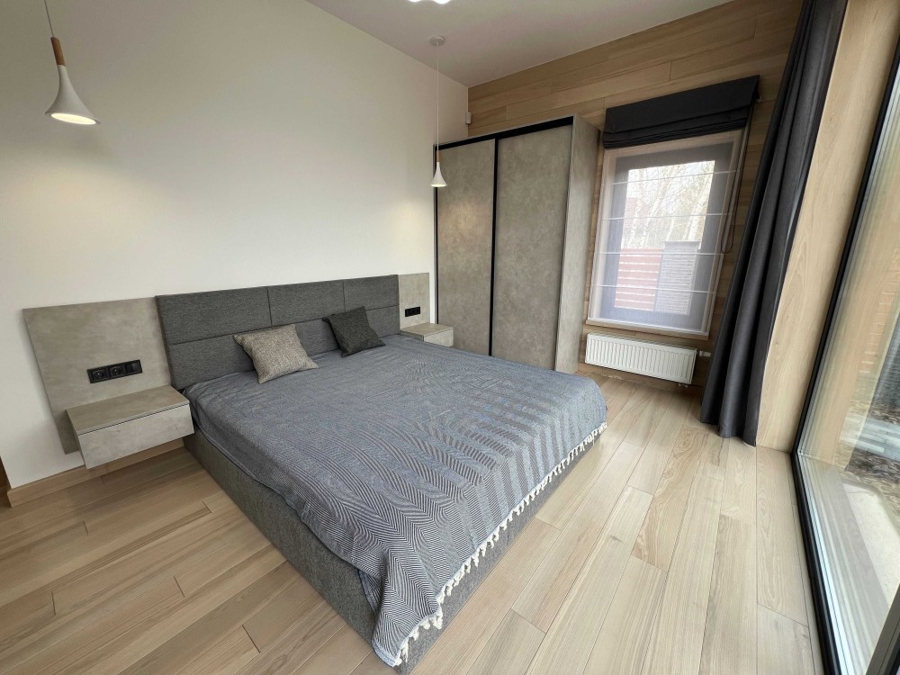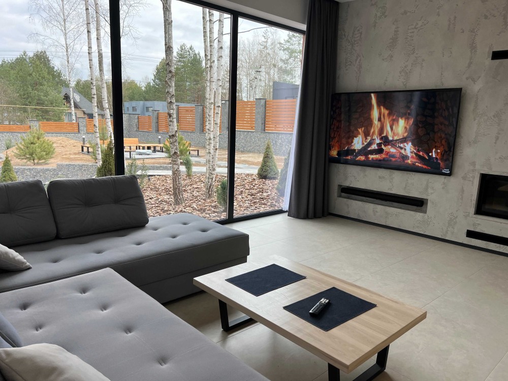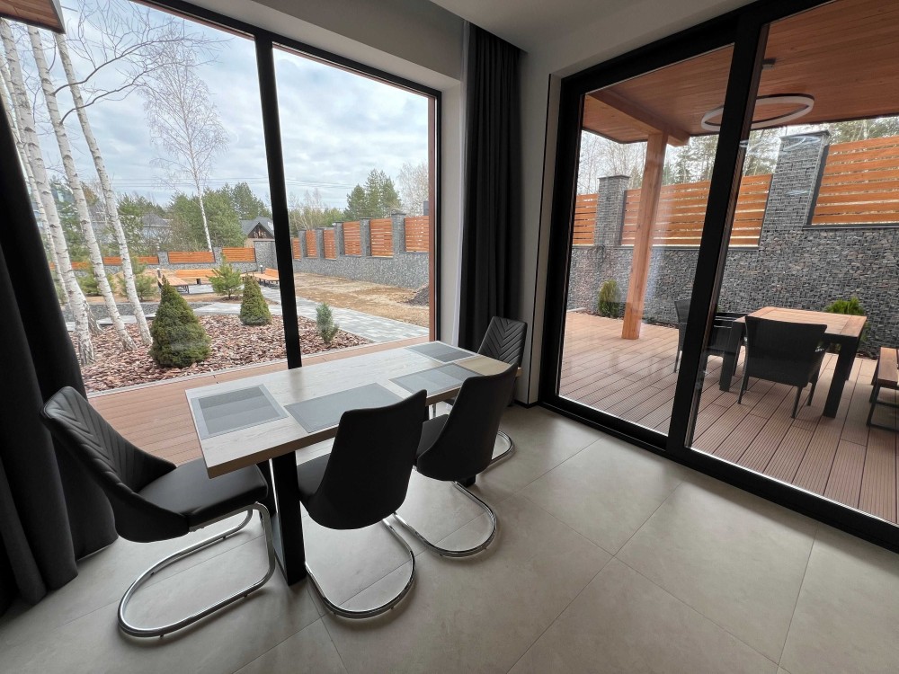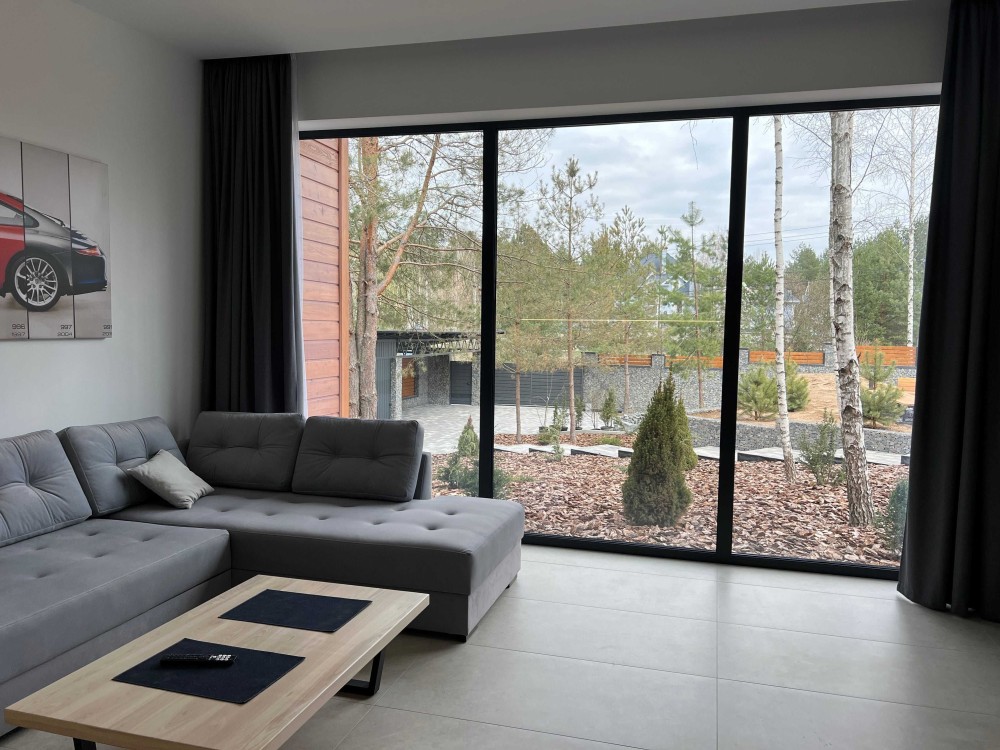 У будинку 4 кімнати, сучасний ремонт, панорамні вікна від підлоги до стелі, багато природного світла.