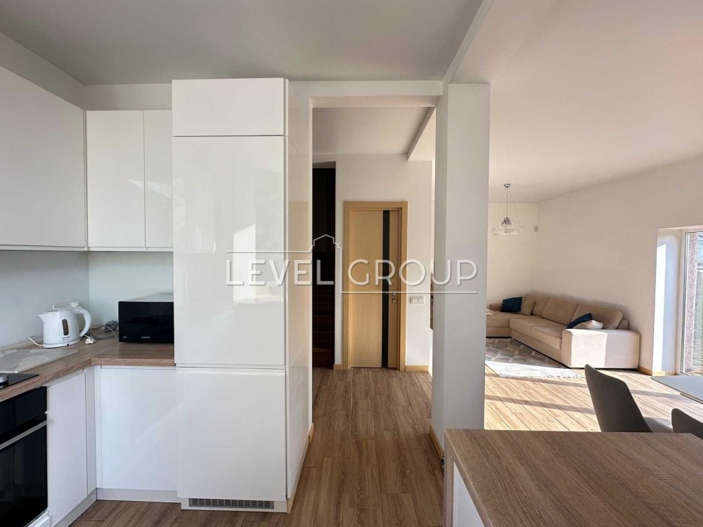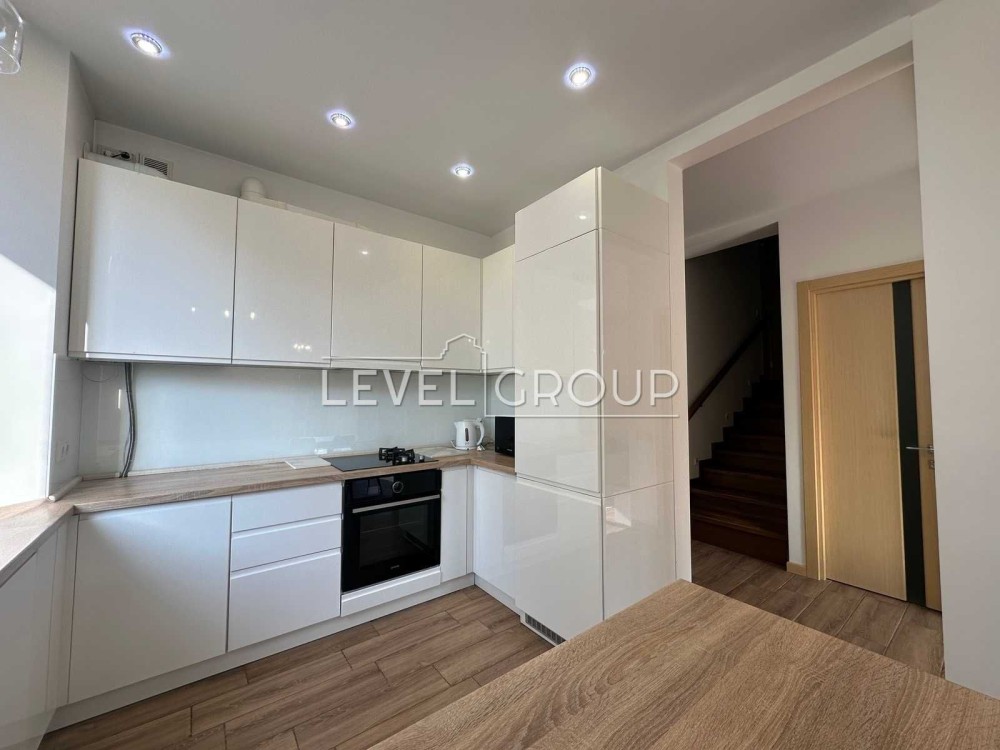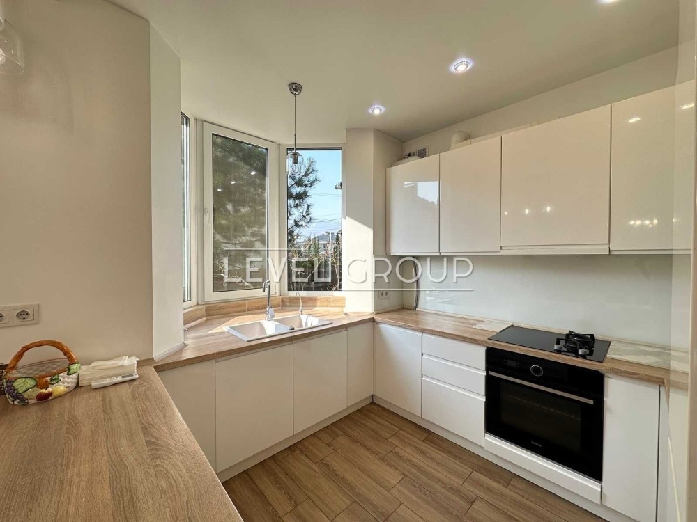 На кухні є ГАЗОВА плита плюс індукція, СВЧ, вбудований холодильник, витяжка, посудомийна машина. Із вітальні вихід у зелений внутрішній двір. Кондиціонер cooperhunter.