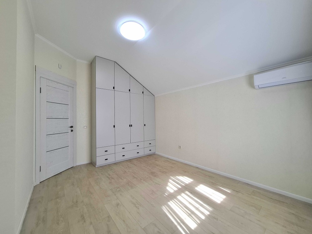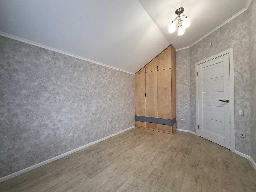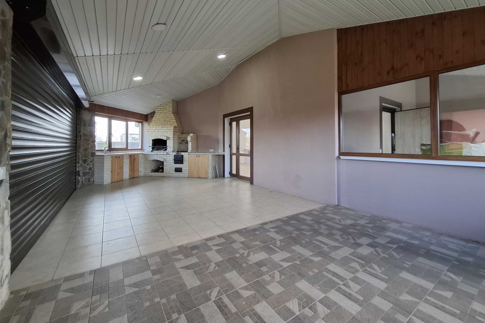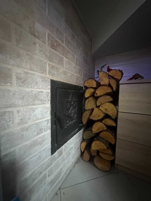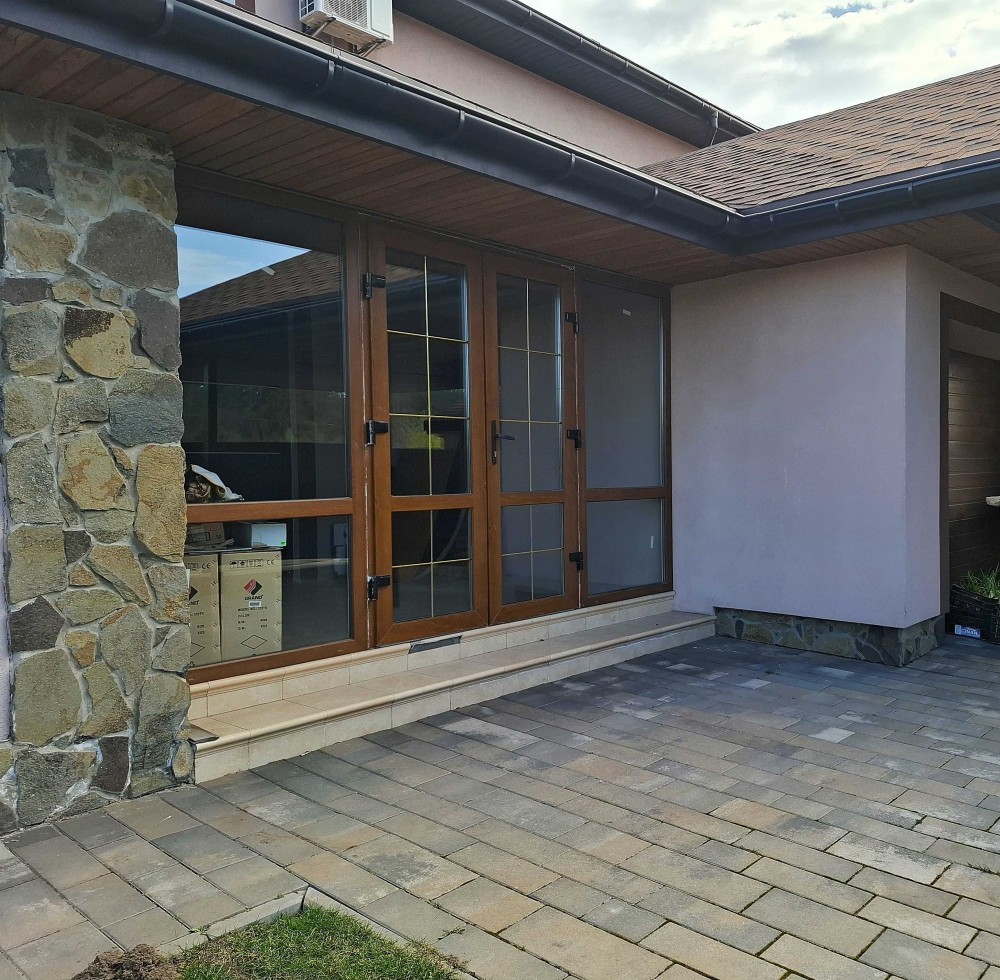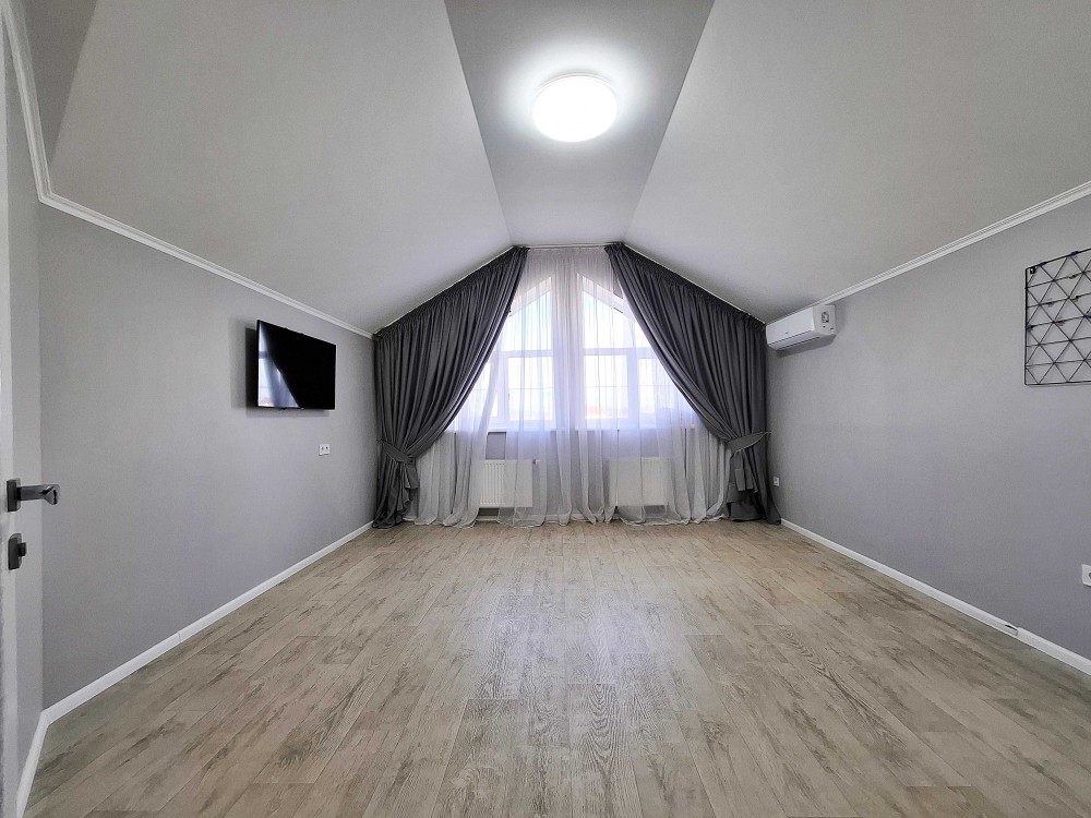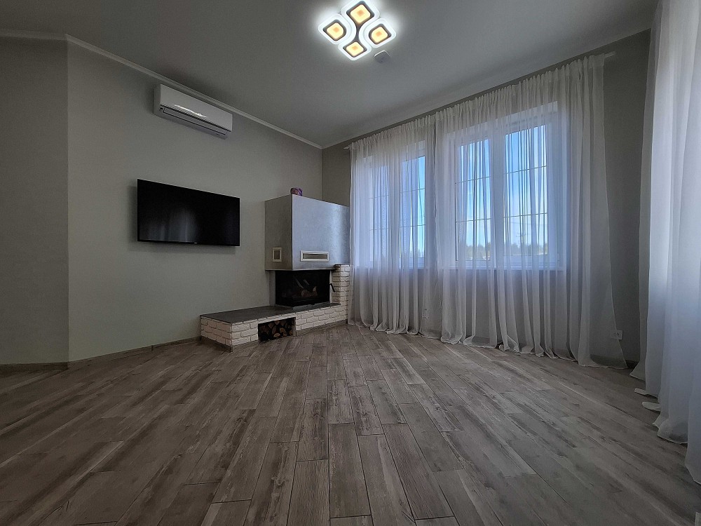Великий будинок: два поверхи, 127,2 кв.м. + закрита тераса 40 кв.м. Всього 167 кв.м. Перший поверх, простора кухня – гостьова на три вікна з каміном та кондиціонером. Вбудована кухня з антресолями до стелі. Барна стійка. Велика гардеробна, гостьовий сан вузол з душовою кабіною. Сходи класичні, дерев’яні. Під сходами ніші для зберігання. Для технічного оснащення будинку виділена окрема кімната, електричний котел, система очищення води, виводи під пральну машину, сушка для білизни. Гараж з автоматичними воротами, в гараж двері виходять з будинку. С зала вихід на велику терасу: цегляний мангал з димоходом, літня кухня, виведена вода, є мийка, та шафи для посуду, місце для проведення смачного часу в колі сім’ї. Другий поверх: три спальні, гардеробна кімната, та великий сан вузол.