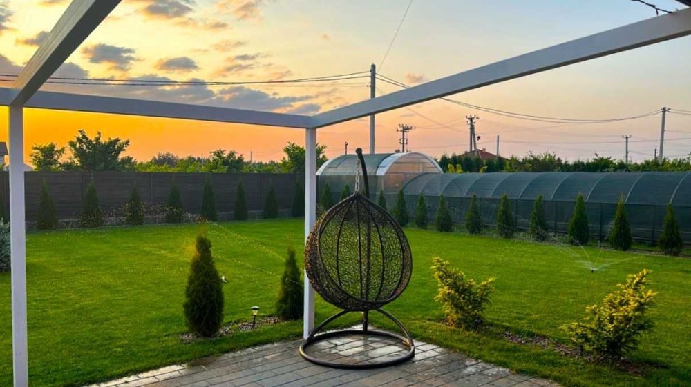 Територія: 10 соток землі, рівний квадрат. Вся територія огороджена дерев’яним забором. Автоматичні ворота, гостьовий навіс на дві машини на вулиці, та парко місця на дві машини у дворі з навісом. Викладені доріжки, та тераса перед домом, місце насолоди спогладання за красивим сходом сонця, та неймовірними заходами. Застелений газон, автоматичний полив. По периметру засаджені туї, під них виведено крапельний полив. Кругла клумба, та блакитна ель. По периметру реалізована підсвітка території, та доріжок. Якщо у вас в родині є запит на свіженьку зелень, зі своєї городини, тут є вже оздоблені, ну дуже цивільні, високі, «теплі» грядки, і невеликий парник. В подарунок вам лишається солодка полуниця. Висадженні ще юні, а вже плодючі фруктові деревця (яблуня, персик, груша.) Навіс для дров, вольєр.
