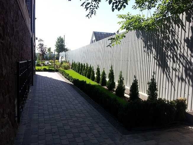 Территория - 18 соток. Ландшафтный дизайн, вечнозеленые туи, кипарисы, можжевельник, самшит и другие деревья. Прогулочная зона, 6 соток газона и цветочные клумбы, место для каркасного бассейна.