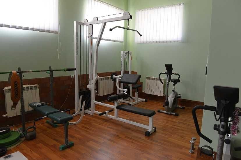 Спортивный зал - тренажеры для силовых упражнений, штанги и гантели, боксерская груша, скамьи для жима и машина Смита, велотренажеры и беговая дорожка, доска Евминова и теннисный стол.