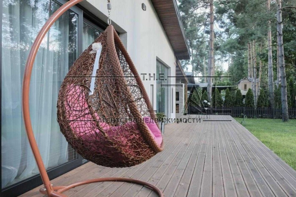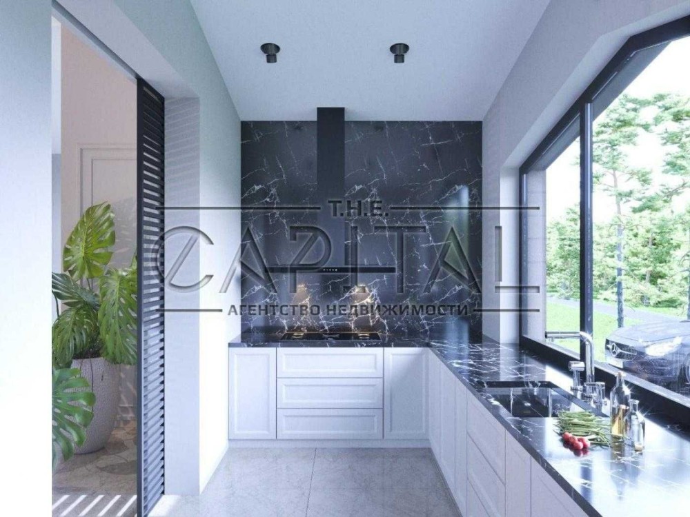 У будинку просторий хол, панорамні вікна, два вбиральні, 5 санвузлів, кухня відокремлена від їдальні-вітальні розсувними системами, гостьовий санвузол, чотири спальні з власним санвузлом, кімната вільного призначення з виходом на простору терасу.