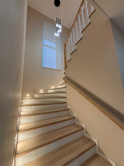 Другий поверх: На другому поверсі знаходяться три спальні, два санвузли та робочий кабінет з виходом на терасу. Основна спальня має власний санвузол, гардеробну кімнату та балкон. Кожна спальня і санвузол виконані в індивідуальному дизайні.