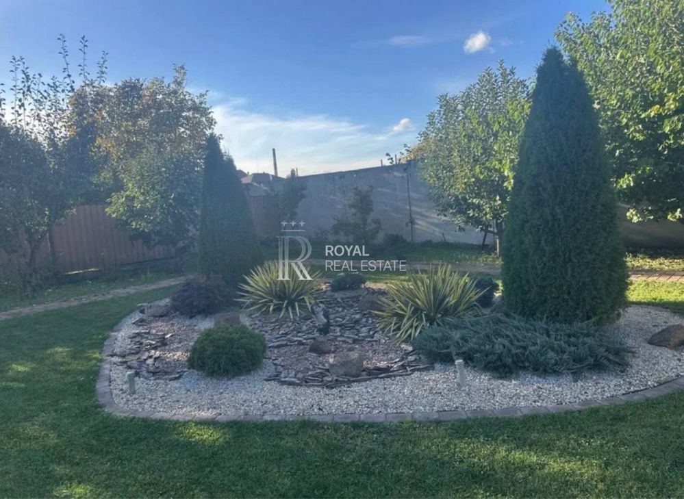 • Газон, квітники, туї, декоративні та фруктові дерева