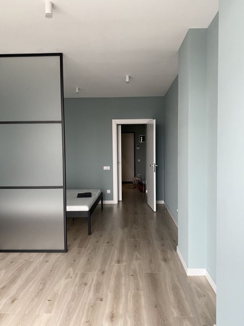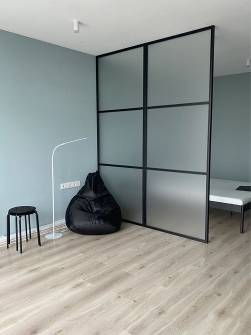 простора кімната зонована на спальню та вітальню скляною перегородкою