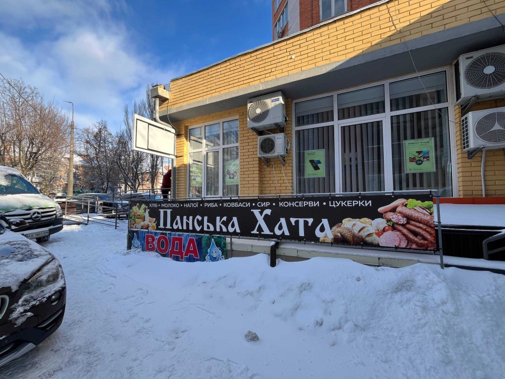 Локаційно знаходиться на цокольному поверсі, фасад житлового будинку на Вокзальній.