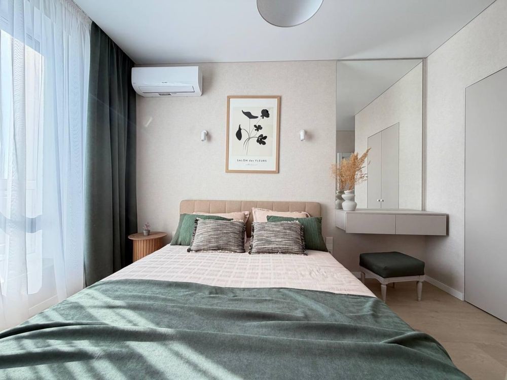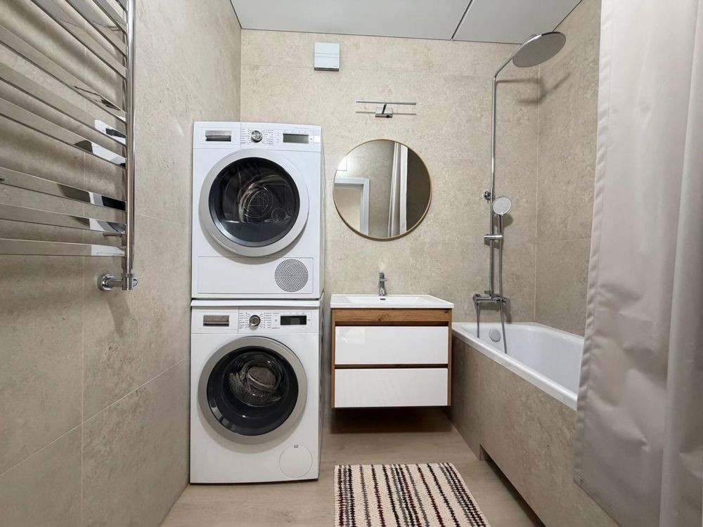 двоспальне ліжко, зона відпочинку + робоче місце, вбудований холодильник, пральна і сушильна машина, посудомийка, кондиціонери у всіх кімнатах, ТВ, оптоволокно.