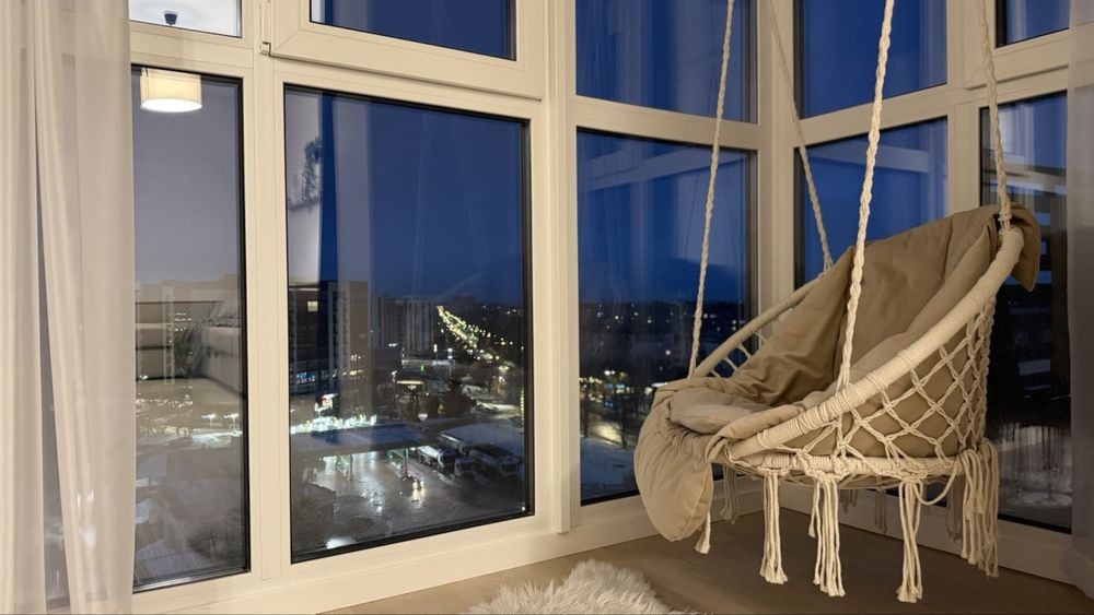 Лоджія з кріслом-гойдалкою і панорамним видом на місто. Закритий двір.