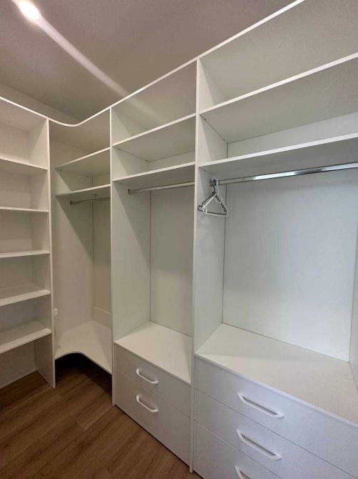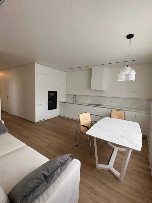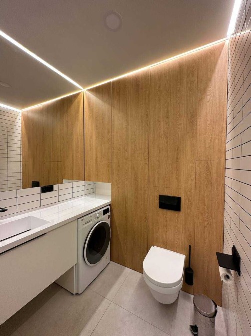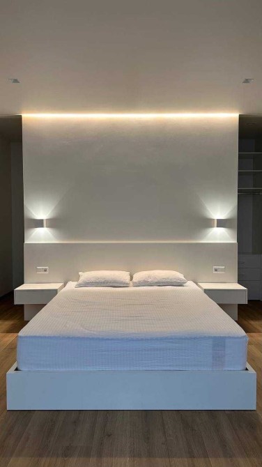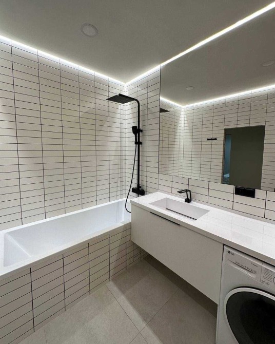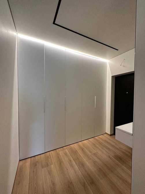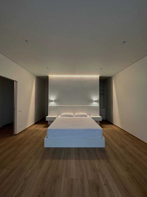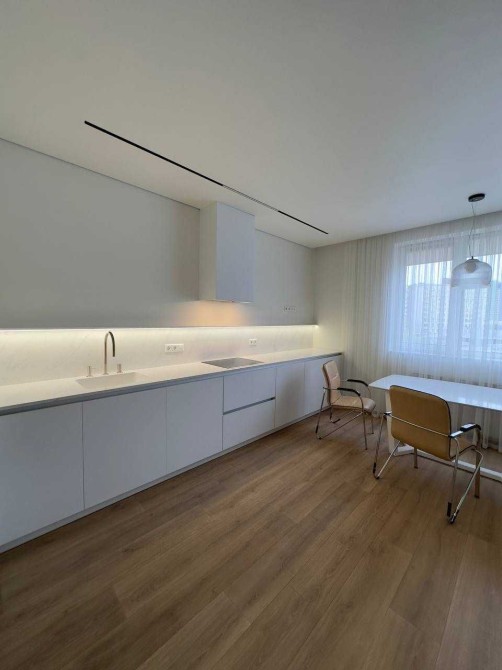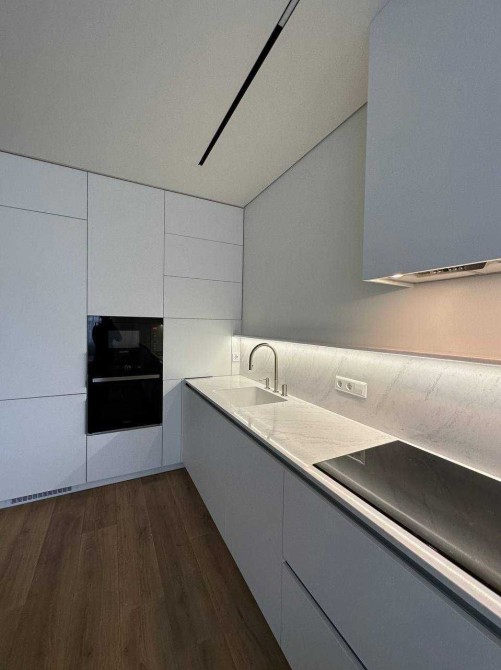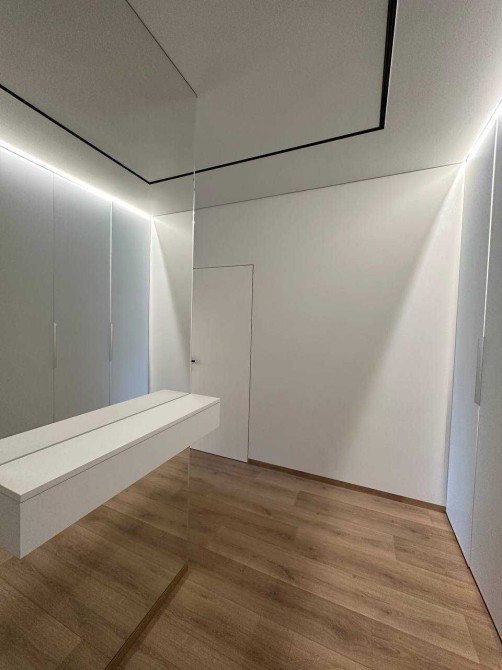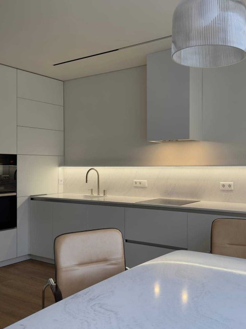 Світла квартира в стилі мінімалізм, продумана до деталей: приховані системи зберігання, лінійне підсвічування, чистий простір для життя й роботи.