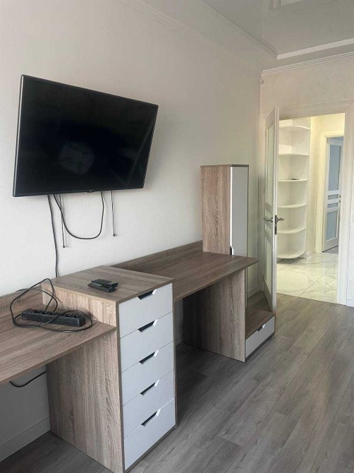 Простора та комфортна квартира у сучасному житловому комплексі. Простора спальня з великим двоспальним ліжком та місткою шафою, дитяча кімната з двоярусним ліжком, двома повноцінними робочими місцями та шафою та окрема кухня.