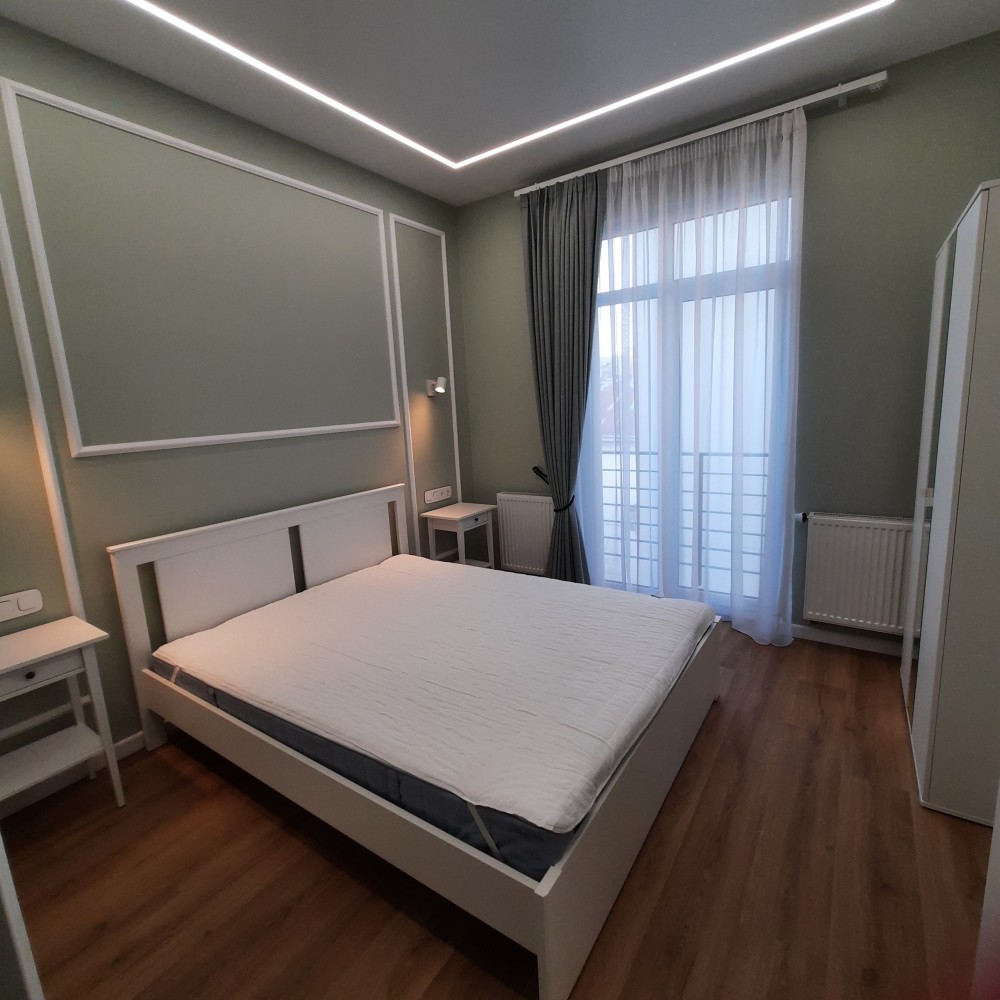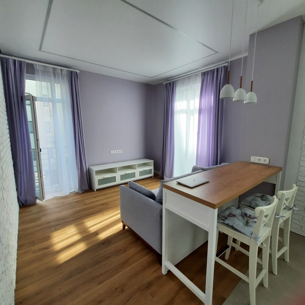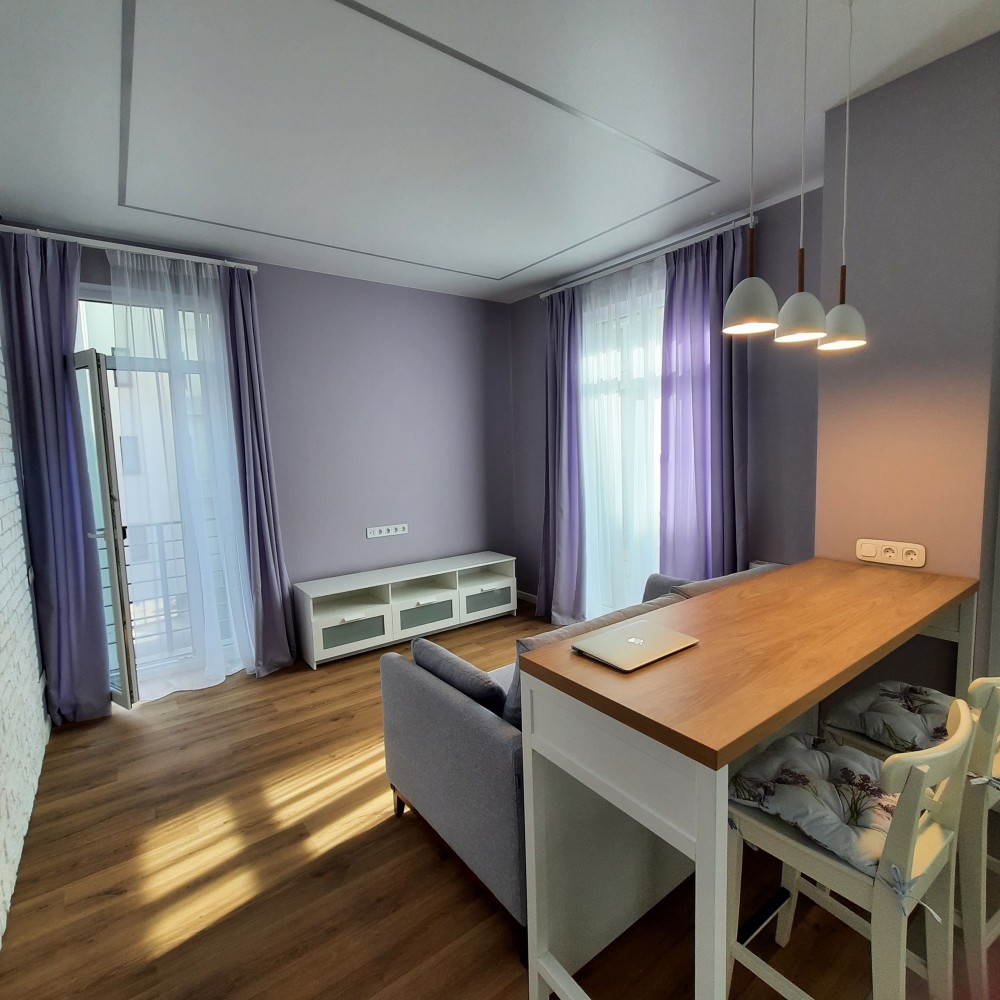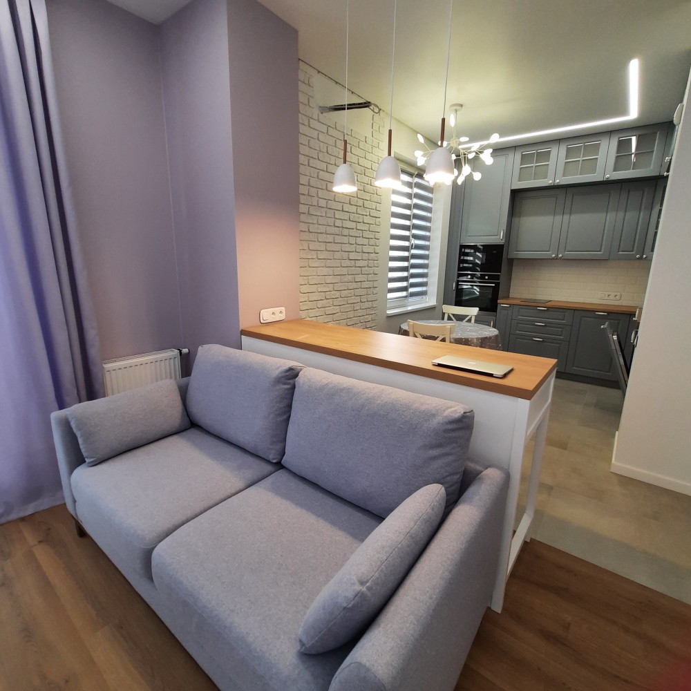 Окрема спальня кімната площею 11.4 кв.м.та вітальня з кухнею площею 24 кв.м. Знаходиться на 3-му поверсі, 5-ти поверхового будинку, на поверсі по дві квартири, є пасажирський ліфт . Вікна в кімнатах високі, що забезпечує хороше освітлення кімнат, оформлені по типу "французьких балкончиків", квартира є дуже тихою і затишною. На території комплексу є відеоспостереження території та ліфта, а також встановлений відеодомофон, який керується моб.додатком. В квартирі проведена сигналізація, аквастоп (система проти затоплення), Wi-Fi та кондиціонер. Квартира повністю умебльована та укомплектована новою технікою (Whirlpool, LG, Electrolux,Viessmann,Gree): індукційна плита, духова шафа, мікрохвильова піч, великий холодильник, посудомийна машина, пральна машина з функцією сушки, двоспальне ліжко з високим , пружинним матрасом, кілька великих містких шаф в коридорі та спальні, дизайнерський, зручний диван у вітальні ,барний стіл зі стільцями , круглий обідній стіл зі стільцями, натяжні стелі з лед-підсвіткою та сучасними люстрами, підлога з підігрівом, вкрита вініловою дошкою та плиткою європ. виробника та ін.На електроенергію стоїть двохтарифний лічильник, що дозволяє заощаджувати, а також зимою вона досить тепла ,без опалення трималося 17°С в кімнатах за рахунок сонячної сторони та внутрішніх стін при зовнішній температурі ~ + 5°С.