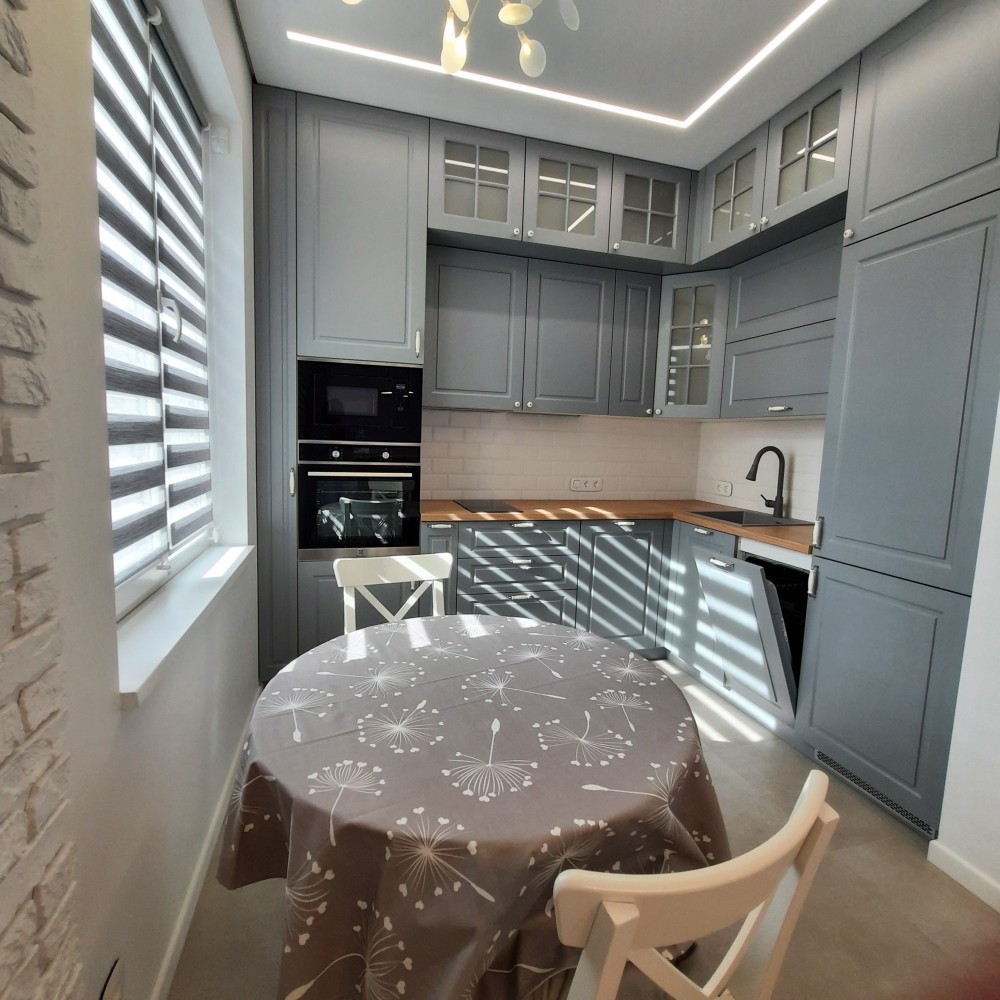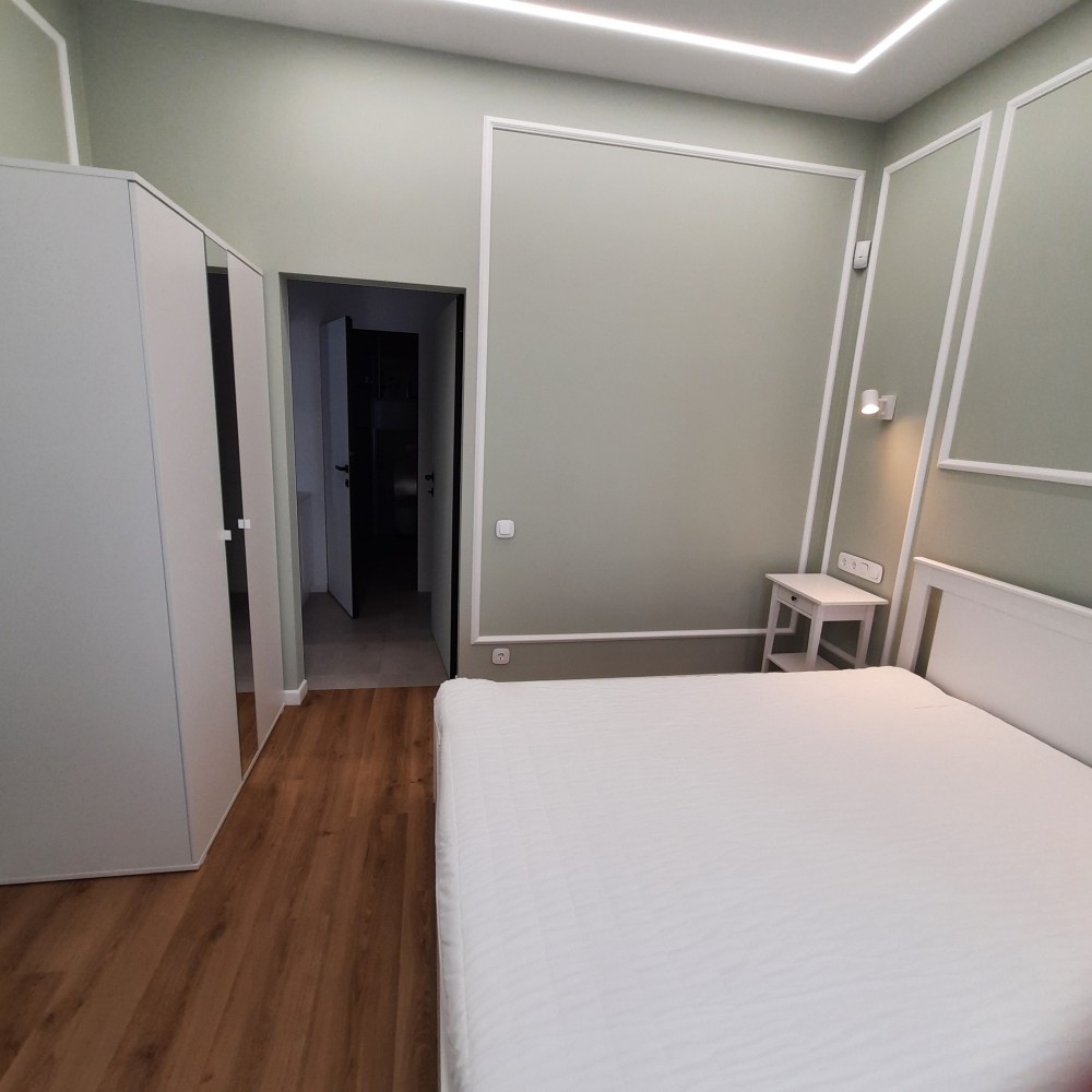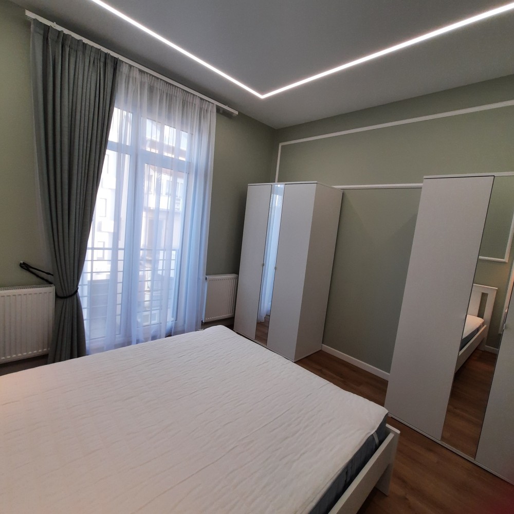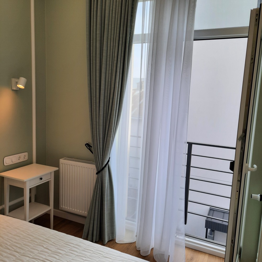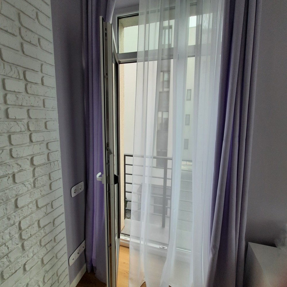 Окрема спальня кімната площею 11.4 кв.м.та вітальня з кухнею площею 24 кв.м. Знаходиться на 3-му поверсі, 5-ти поверхового будинку, на поверсі по дві квартири, є пасажирський ліфт . Вікна в кімнатах високі, що забезпечує хороше освітлення кімнат, оформлені по типу "французьких балкончиків", квартира є дуже тихою і затишною. На території комплексу є відеоспостереження території та ліфта, а також встановлений відеодомофон, який керується моб.додатком. В квартирі проведена сигналізація, аквастоп (система проти затоплення), Wi-Fi та кондиціонер. Квартира повністю умебльована та укомплектована новою технікою (Whirlpool, LG, Electrolux,Viessmann,Gree): індукційна плита, духова шафа, мікрохвильова піч, великий холодильник, посудомийна машина, пральна машина з функцією сушки, двоспальне ліжко з високим , пружинним матрасом, кілька великих містких шаф в коридорі та спальні, дизайнерський, зручний диван у вітальні ,барний стіл зі стільцями , круглий обідній стіл зі стільцями, натяжні стелі з лед-підсвіткою та сучасними люстрами, підлога з підігрівом, вкрита вініловою дошкою та плиткою європ. виробника та ін.На електроенергію стоїть двохтарифний лічильник, що дозволяє заощаджувати, а також зимою вона досить тепла ,без опалення трималося 17°С в кімнатах за рахунок сонячної сторони та внутрішніх стін при зовнішній температурі ~ + 5°С.
