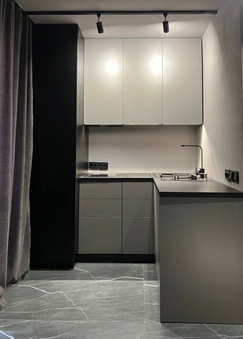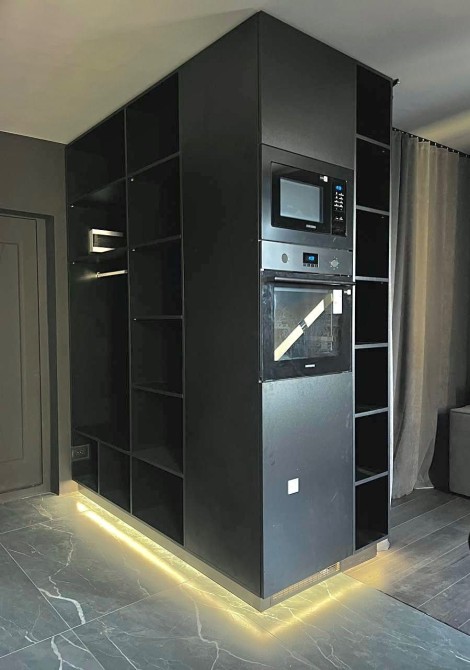 Власне завершили ремонт та зняли захисні плівочки із техніки. В кухонній частині знаходяться вбудовані: мікрохвильова, духовка, холодильник та пральна машинка. В вітальній частині буде розташований телевізор, який не встигли доставити в момент виконання фотографій.